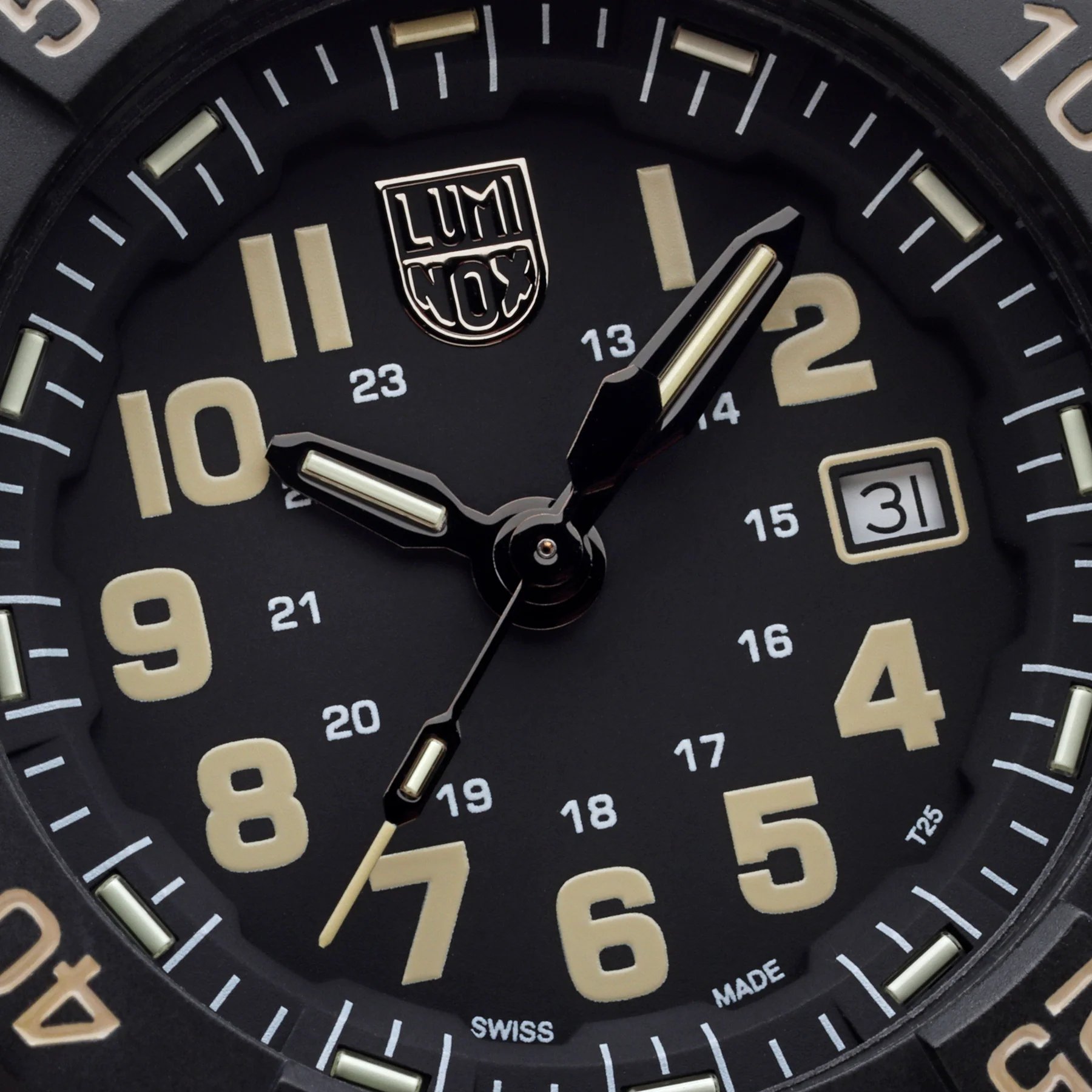 Luminox Navy SEAL 3500 Series XS.3510 sind sportliche Herrenuhren mit Batterieantrieb und einem schwarzen Armband aus CARBONOX™ Kohlefaserverbundstoff. Das Gehäuse aus demselben Material hat einen Durchmesser von 45 Millimetern, eine einseitig drehbare Lünette, einen Stahlboden und eine verschraubte Krone. Das schwarze Zifferblatt mit Datumsanzeige und 24-Stunden-Zeitformat ist mit einem robusten Mineralglas geschützt. Zeiger, Indizes und der Punkt auf der Lünette sind mit LLT-Leuchtbeschichtung versehen, die nach dem Aufladen die Lesbarkeit bei schlechten Lichtverhältnissen erleichtert. Der Antrieb der Uhr wird durch das schweizerische Quarzwerk Ronda 515 mit einer Genauigkeit von -10/+20 Sekunden pro Monat gewährleistet. Mit einer Wasserdichtigkeit von 20 ATM sind die Uhren für das Tauchen in großen Tiefen geeignet.