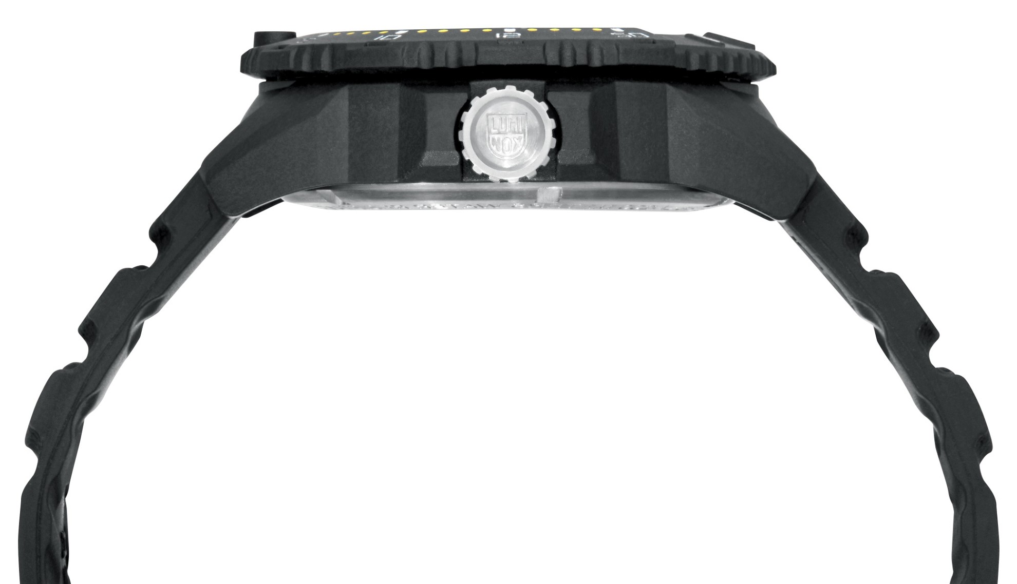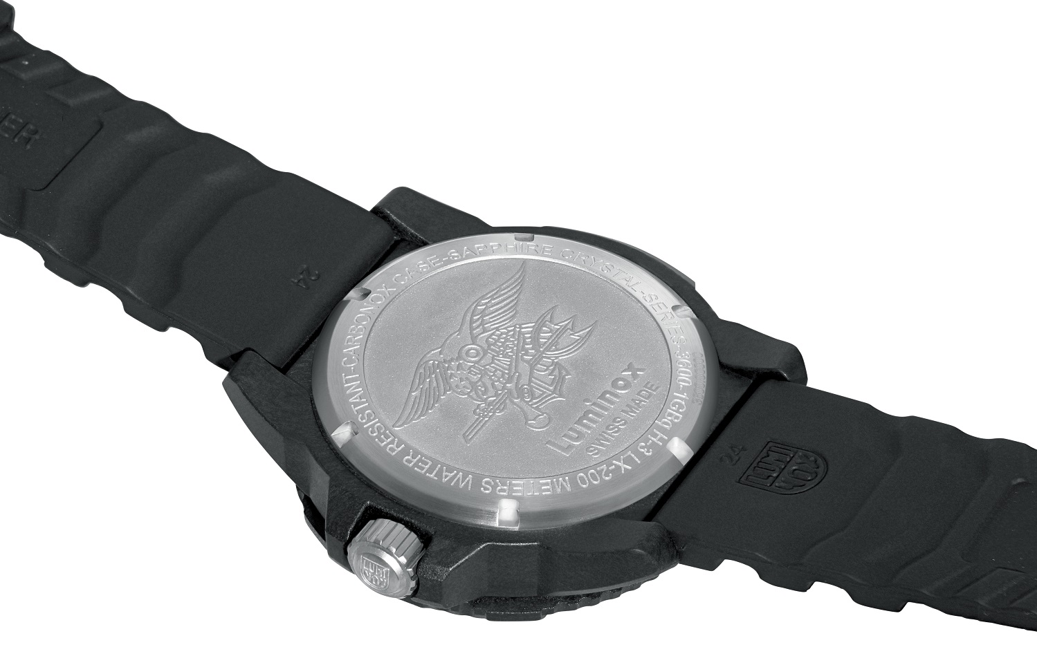 Luminox Navy SEAL 3600 Series XS.3601 sind batteriebetriebene Herrensportuhren mit einem schwarzen Kautschukarmband und Dornschließe. Das Gehäuse aus CARBONOX™-Kohlefaserverbundstoff hat einen Durchmesser von 45 Millimetern, eine einseitig drehbare Lünette, einen Stahlboden und eine verschraubte Krone. Das schwarze Zifferblatt mit Lupe über der Datumsanzeige und 24-Stunden-Zeitanzeige wird durch ein widerstandsfähiges Saphirglas mit Antireflexbeschichtung geschützt. Die Zeiger, Indizes und der Punkt auf der Lünette sind mit einem LLT-Leuchtanstrich versehen, der nach dem Aufladen die Ablesbarkeit bei schlechten Lichtverhältnissen erleichtert. Das Uhrwerk wird von einem Schweizer Quarzwerk Ronda 515 mit einer Genauigkeit von -10/+20 Sekunden pro Monat angetrieben. Mit einer Wasserdichtigkeit von 20 ATM sind die Uhren für das Tiefseetauchen geeignet.