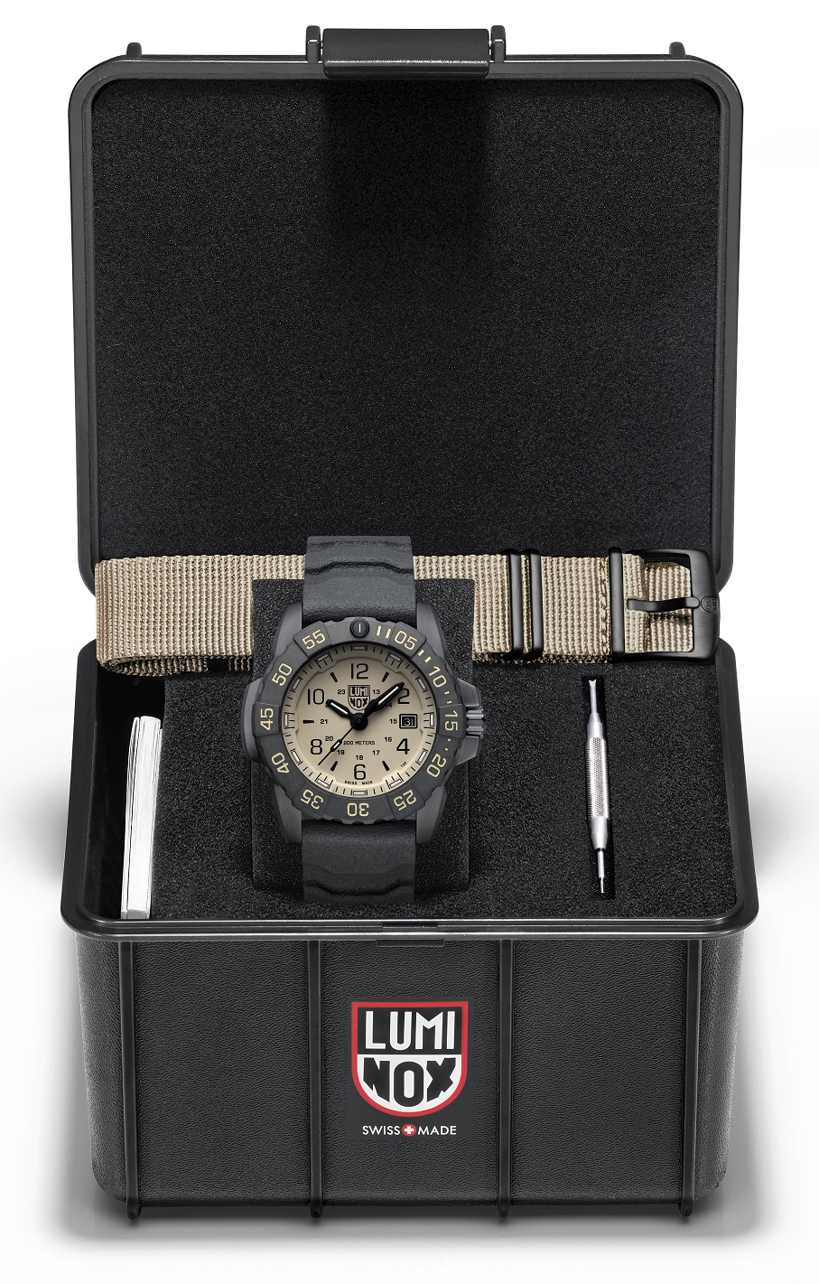 Luminox Navy SEAL Foundation XS.3251.CBNSF.SET sind Herren-Quarz-Sportuhren mit einem schwarzen Kautschukband und Dornschließe. Das Gehäuse aus Edelstahl mit schwarzer PVD-Beschichtung hat einen Durchmesser von 45 Millimetern, eine einseitig drehbare Lünette aus CARBONOX™-Kohlefaser-Verbundwerkstoff und eine verschraubte Krone. Das beige Zifferblatt mit Datumsanzeige und 24-Stunden-Zeitformat wird durch ein robustes Saphirglas mit Antireflexbeschichtung geschützt. Die Zeiger, Indizes und der Punkt auf der Lünette sind mit einer LLT-Leuchtbeschichtung versehen, die nach Beleuchtung die Lesbarkeit bei schlechten Lichtverhältnissen erleichtert. Der Antrieb der Uhr erfolgt durch ein Schweizer Quarzwerk Ronda 715 mit einer Genauigkeit von -10/+20 Sekunden pro Monat. Mit einer Wasserdichtigkeit von 20 ATM sind die Uhren für das Tieftauchen geeignet. Im Lieferumfang enthalten ist ein beiger NATO-Ersatzband und ein Werkzeug zum Bandwechsel.
