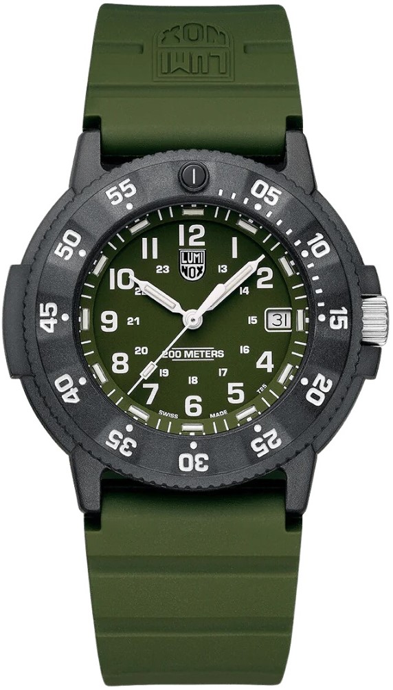 Luminox Original Navy SEAL 3000 Series XS.3013.EVO.S sind Herren-Quarz-Sportuhren mit einem grünen Kautschukarmband mit Dornschließe. Das Gehäuse aus Carbon-Verbundmaterial CARBONOX™ mit einem Durchmesser von 43 Millimetern hat eine einseitig drehbare Lünette, einen Stahlboden und eine verschraubte Krone. Das grüne Zifferblatt mit Datumsanzeige und 24-Stunden-Zeitformat ist durch ein robustes Saphirglas mit Antireflexbeschichtung geschützt. Zeiger, Indizes und Punkt auf der Lünette verfügen über eine LLT-Leuchtbeschichtung, die nach dem Aufladen die Lesbarkeit bei schlechten Lichtverhältnissen erleichtert. Der Antrieb der Uhr wird durch ein Schweizer Quarzwerk Ronda 515 mit einer Genauigkeit von -10/+20 Sekunden pro Monat gewährleistet. Mit einer Wasserdichtigkeit von 20 ATM sind die Uhren für das Tieftauchen geeignet.