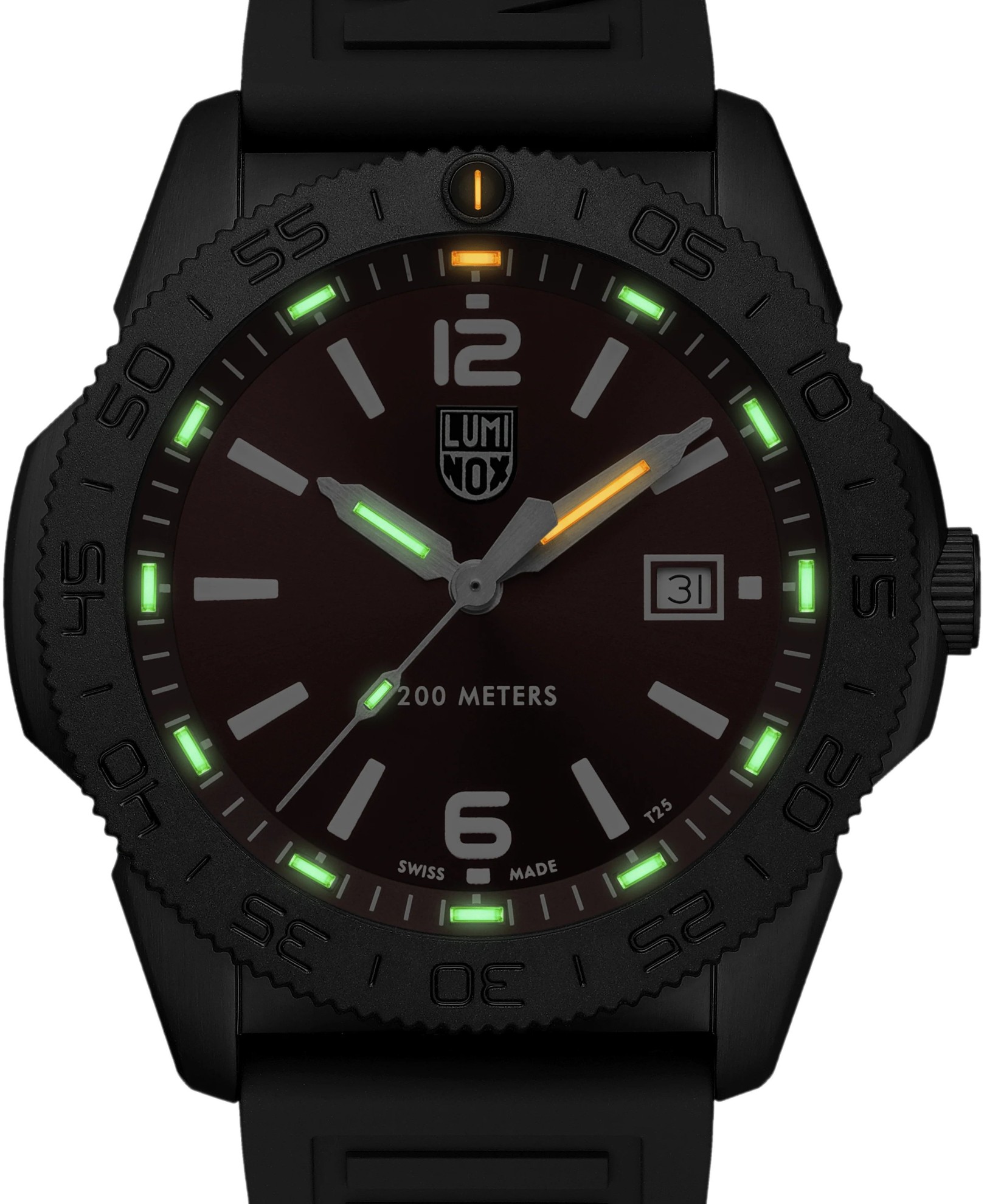 Die einzigartige Luminox Light Technology sorgt für Sichtbarkeit auf den ersten Blick - die Technologie der Luminox-Uhren gewährleistet kontinuierliches Leuchten unabhängig von den Wetterbedingungen für bis zu 25 Jahre. Always Visible bedeutet, dass das Beleuchtungssystem der Luminox Light Technology (LLT), d.h. kleine Glasröhrchen, die die Uhr beleuchten, eine Garantie für 10 Jahre Leuchten haben. Die Leuchtmittel leuchten 25 Jahre, wobei die Sichtbarkeit vom individuellen Sehvermögen, der Farbe der Röhre und dem Zustand des Uhrglases abhängt. Die meisten anderen Uhren verwenden Leuchtfarbe, die dadurch gekennzeichnet ist, dass die Lichtquelle aufgeladen werden muss und sehr schnell schwächer wird, oder ein „push-to-light“-System, bei dem ein Knopf bei batteriebetriebenen Lichtern gedrückt werden muss. Jede Luminox-Uhr enthält kleine, selbstleuchtende Mikrogaslicht-Röhrchen (Kapseln aus Borosilikatglas), die permanent leuchten. Die Kapseln sind auf den Zeigern, Indizes und bei Bedarf auch auf der Lünette platziert. Diese Licht-Röhrchen sind sicher für Mensch und Umwelt und werden in jede Uhr von Hand eingebaut. Gasförmiges Tritium, das Licht ausstrahlt, ist eine radioaktive Form von gewöhnlichem gasförmigem Wasserstoff. Gasförmiges Tritium ist innerhalb dieser kleinen Borosilikatglasröhrchen eingeschlossen und strahlt kontinuierlich Licht aus. Jedes Borosilikatglasröhrchen wird mit Laser geschnitten und versiegelt.