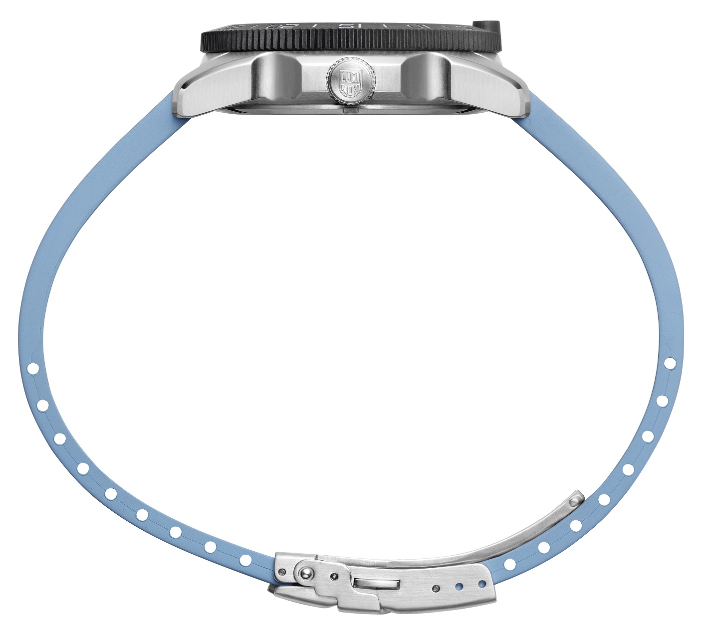Luminox Pacific Diver 3120M Series XS.3124M sind Damen-Quarz-Uhren mit einem hellblauen Kautschukarmband und einer Faltschließe. Das Gehäuse aus Edelstahl hat einen Durchmesser von 39 Millimetern und eine einseitig drehbare Lünette aus CARBONOX™-Kohlefaserverbundstoff. Das Perlmutt-Zifferblatt mit Datumsanzeige auf der Drei-Uhr-Position ist durch ein widerstandsfähiges Saphirglas mit Antireflexbeschichtung geschützt und seine Schönheit kommt besonders bei direktem Licht zur Geltung, wenn das Farbspiel des Perlmutts beobachtet werden kann. Die Zeiger, Indizes und der Punkt auf der Lünette sind mit einer LLT-Leuchtbeschichtung versehen, die nach Beleuchtung die Lesbarkeit bei schlechten Lichtverhältnissen erleichtert. Der Antrieb der Uhr erfolgt durch ein schweizerisches Quarzwerk Ronda 515 mit einer Genauigkeit von -10/+20 Sekunden pro Monat. Mit einer Wasserdichtigkeit von 20 ATM ist die Uhr für das Tiefseetauchen geeignet.