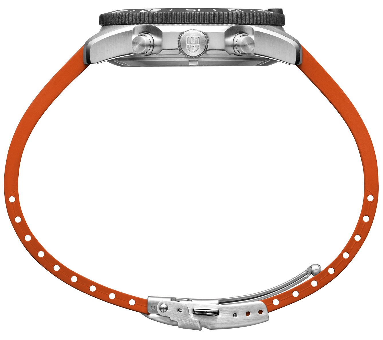 Luminox Pacific Diver Chronograph 3140 Series XS.3149 sind Herren-Batterieuhren mit einem orangefarbenen Kautschukarmband mit Faltschließe. Das Gehäuse aus Edelstahl hat einen Durchmesser von 44 Millimetern, eine einseitig drehbare Lünette aus Carbon-Verbundwerkstoff CARBONOX™ und eine verschraubte Krone. Das orange-schwarze Zifferblatt mit Stoppuhr und Datums- und Wochentagsanzeige wird durch ein widerstandsfähiges Saphirglas mit Antireflexbeschichtung geschützt. Die Zeiger, Indizes und der Punkt auf der Lünette sind mit einem LLT-Leuchtanstrich versehen, der nach Beleuchtung die Lesbarkeit bei schlechten Lichtverhältnissen erleichtert. Das Uhrwerk wird durch ein Schweizer Quarzwerk Ronda Z60 mit einer Genauigkeit von -10/+20 Sekunden pro Monat angetrieben. Mit einer Wasserdichtigkeit von 20 ATM sind die Uhren für Tiefseetauchen geeignet.