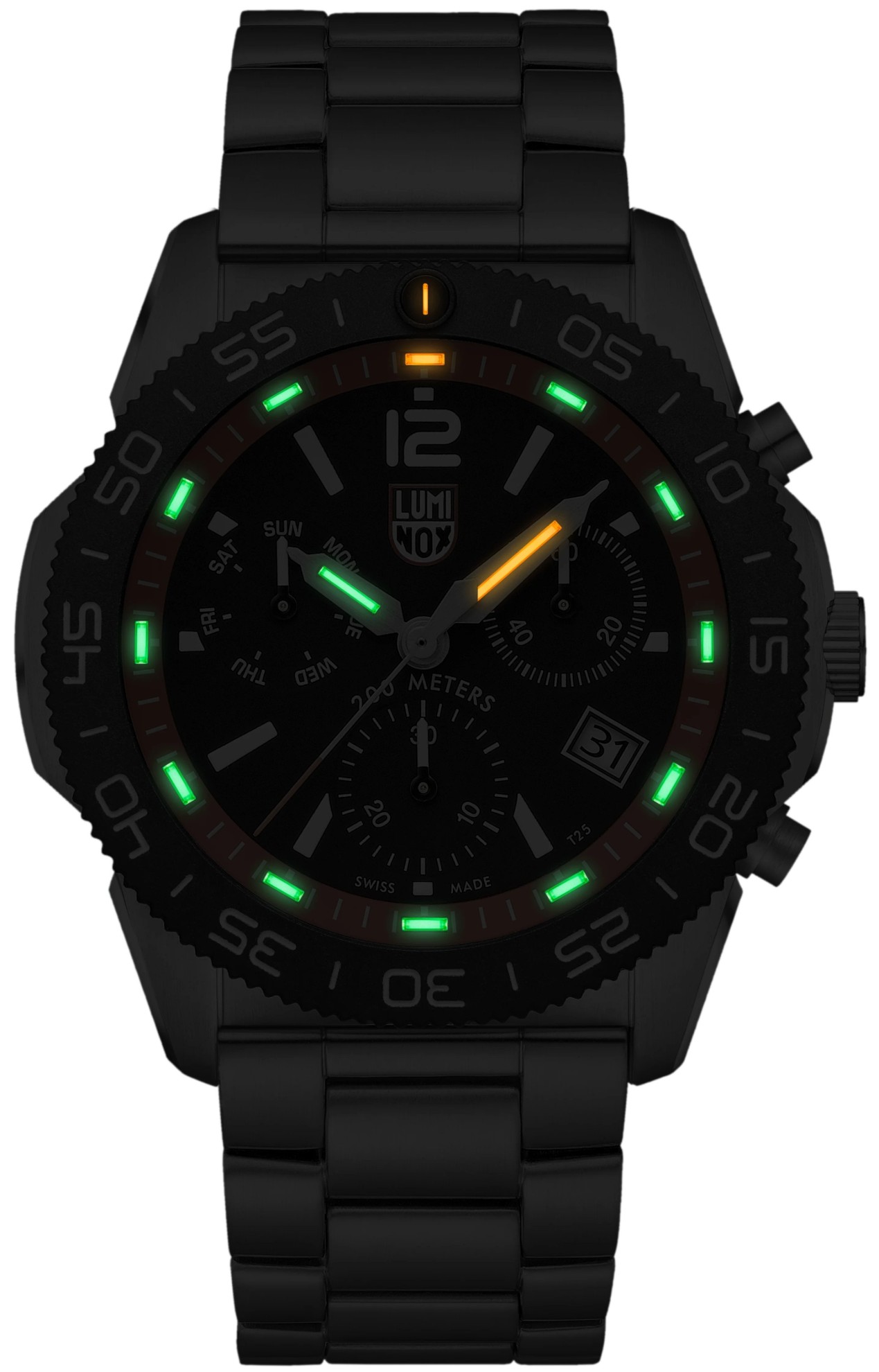 Luminox Pacific Diver Chronograph 3140 Series XS.3149.M sind sportliche Herren-Quarzuhren mit einem Stahlarmband und einer Klappschließe. Das Edelstahlgehäuse hat einen Durchmesser von 44 Millimetern, eine einseitig drehbare Lünette aus Carbon-Verbundwerkstoff CARBONOX™ und eine verschraubte Krone. Das orange-schwarze Zifferblatt mit Stoppuhr und Anzeige von Datum und Wochentag wird durch ein widerstandsfähiges Saphirglas mit Antireflexbeschichtung geschützt. Die Zeiger, Indizes und der Punkt auf der Lünette sind mit einem leuchtenden LLT-Anstrich versehen, der nach dem Aufladen die Lesbarkeit bei schlechten Lichtverhältnissen erleichtert. Der Antrieb der Uhr wird durch ein Schweizer Quarzwerk Ronda Z60 mit einer Genauigkeit von -10/+20 Sekunden pro Monat gewährleistet. Mit einer Wasserdichtigkeit von 20 ATM ist die Uhr für das Tiefseetauchen geeignet.