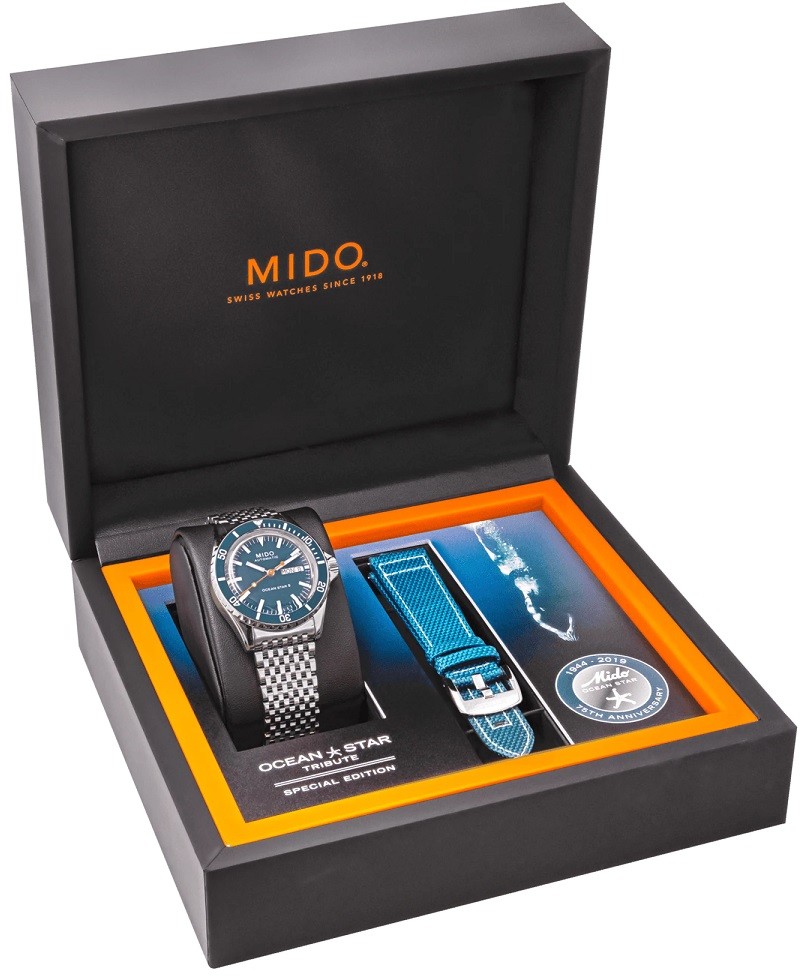 Die Uhr wird zusätzlich mit einem blauen Textilarmband mit weißer Naht und Dornschließe geliefert.