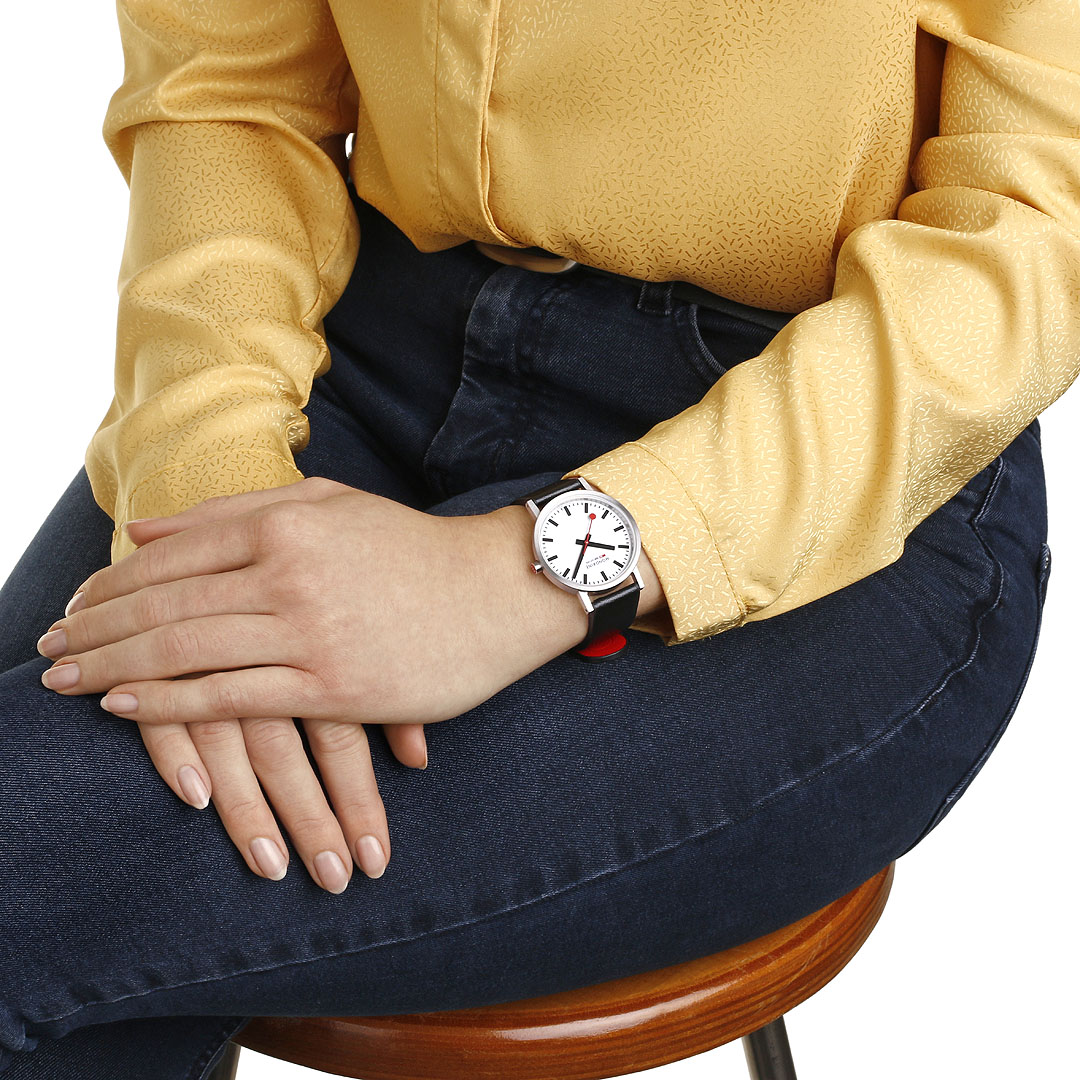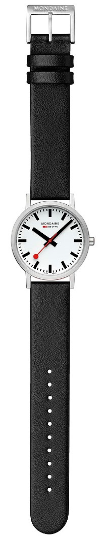 MONDAINE Classic A660.30314.16SBBV sind Damenuhren mit einem schwarzen Armband aus veganem Leder mit Dornschließe. Das Gehäuse aus Edelstahl hat einen Durchmesser von 36 Millimetern. Das übersichtliche weiße Zifferblatt ist durch ein Mineralglas geschützt und inspiriert von ikonischen Bahnhofsuhrendesigns mit einem roten Sekundenzeiger. Das Uhrwerk wird von einem Quarzwerk Ronda 513 angetrieben. Mit einer Wasserdichtigkeit von 3 ATM sind die Uhren regen- und spritzwassergeschützt.