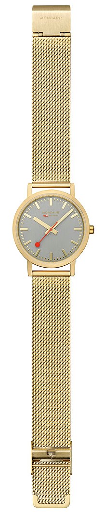 MONDAINE Classic A660.30314.80SBM sind elegante Damenuhren mit einem Milanaise-Armband aus Stahl mit goldfarbener PVD-Beschichtung und Schiebeschließe. Das Edelstahlgehäuse in derselben Farbe hat einen Durchmesser von 36 Millimetern. Das übersichtliche graue Zifferblatt wird durch ein Mineralglas geschützt und ist von den ikonischen Bahnhofsuhr inspiriert, mit einem roten Sekundenzeiger. Der Antrieb der Uhr erfolgt durch ein Quarzwerk Ronda 513. Mit einer Wasserdichtigkeit von 3 ATM sind die Uhren regen- und handwaschfest.
