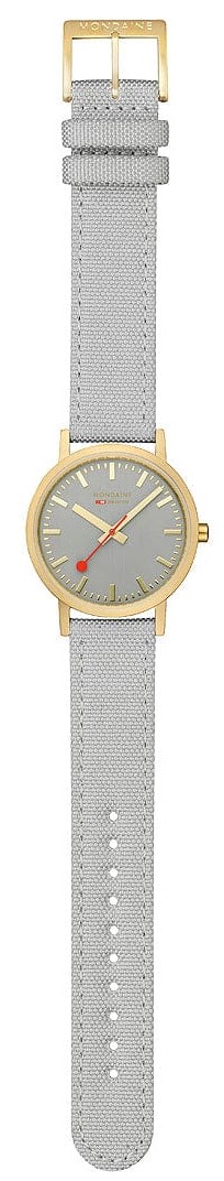 MONDAINE Classic A660.30314.80SBU sind Damenuhren mit einem grauen Textilarmband aus recycelten PET-Flaschen mit Korkfutter und Dornschließe. Das Gehäuse aus Edelstahl mit PVD-Beschichtung in Goldfarbe hat einen Durchmesser von 36 Millimetern. Das übersichtliche graue Zifferblatt ist durch ein Mineralglas geschützt und inspiriert von den ikonischen Bahnhofsuhr mit rotem Sekundenzeiger. Der Antrieb der Uhr erfolgt durch ein Quarzwerk Ronda 513. Mit einer Wasserdichtigkeit von 3 ATM sind die Uhren regen- und handwaschbeständig.