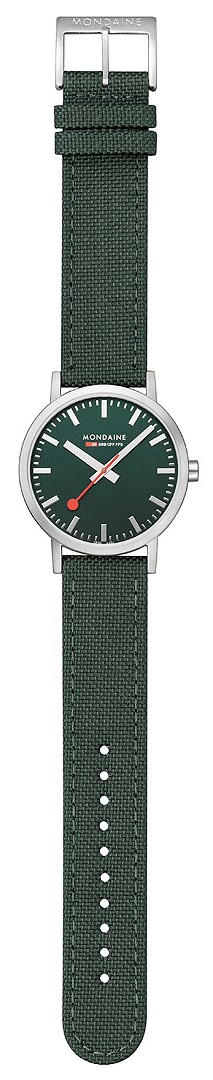 MONDAINE Classic A660.30360.60SBF sind Herrenuhren mit einem grünen Textilarmband aus recycelten PET-Flaschen mit Korkfutter und einer Dornschließe. Das Edelstahlgehäuse hat einen Durchmesser von 40 Millimetern. Das übersichtliche grüne Zifferblatt ist durch ein Mineralglas geschützt und ist von den ikonischen Bahnhofsuhr inspiriert, mit einem roten Sekundenzeiger. Das Uhrwerk wird durch ein Quarzwerk Ronda 513 angetrieben. Mit einer Wasserdichtigkeit von 3 ATM sind die Uhren regen- und handwaschbeständig.