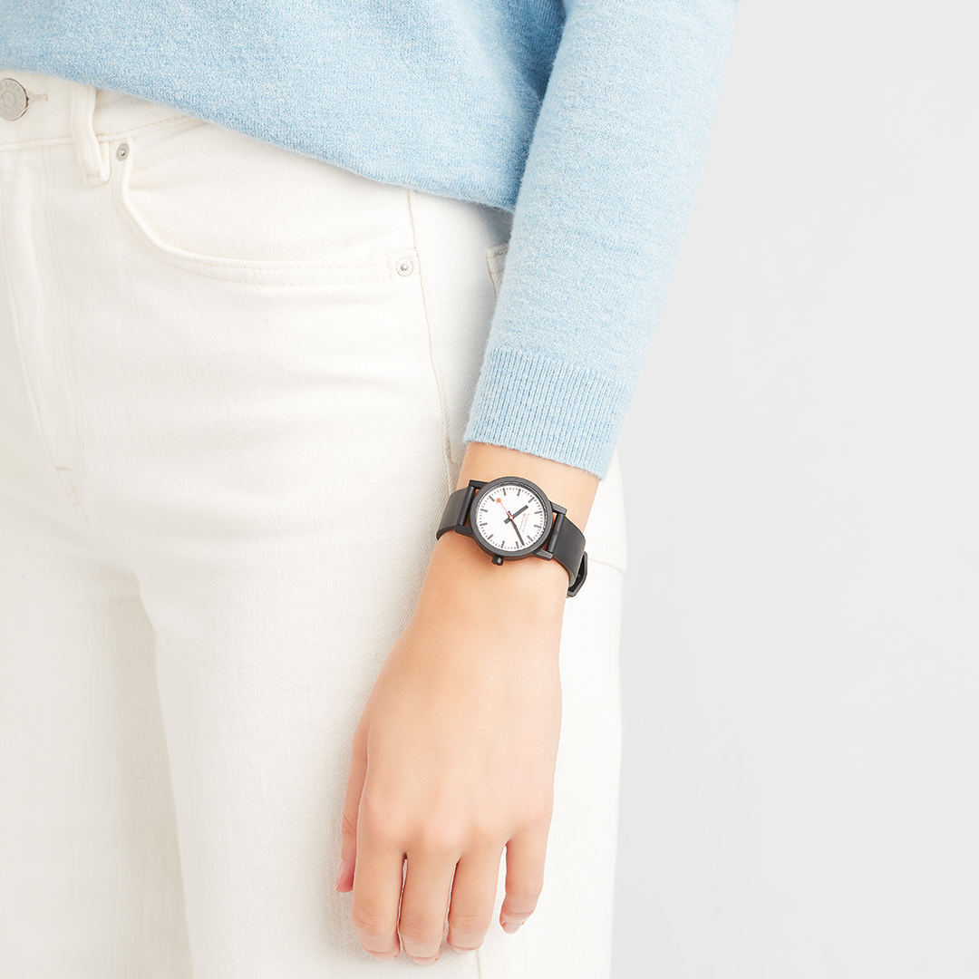 MONDAINE Essence MS1.32110.RB sind Damenuhren mit einem schwarzen Kunststoffarmband auf Basis von Rizinusöl und einer Dornschließe. Das Gehäuse mit einem Durchmesser von 32 Millimetern besteht aus recyceltem Kunststoff. Das übersichtliche weiße Zifferblatt wird durch ein Mineralglas geschützt und ist von den ikonischen Bahnhofsuhr mit rotem Sekundenzeiger inspiriert. Der Antrieb der Uhr wird durch ein Quarzwerk Ronda 513 gewährleistet. Mit einer Wasserdichtigkeit von 3 ATM sind die Uhren regen- und handwaschfest.