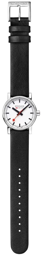 MONDAINE Evo2 MSE.30110.LBV sind elegante Damen-Quarzuhren mit einem schwarzen Armband aus veganem Leder mit Dornschließe. Das Gehäuse aus Edelstahl hat einen Durchmesser von 30 Millimetern. Das übersichtliche weiße Zifferblatt wird durch ein Saphirglas geschützt und ist von ikonischen Bahnhofsuhrendesigns mit einem roten Sekundenzeiger inspiriert. Der Antrieb der Uhr erfolgt durch ein Quarzwerk Ronda 503. Mit einer Wasserdichtigkeit von 3 ATM sind die Uhren regen- und handwaschbeständig.