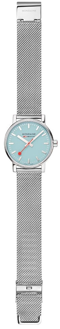 MONDAINE Evo2 MSE.35140.SM sind elegante Damen-Batterieuhren mit einem Milanaise-Armband aus Stahl mit einer verstellbaren Schließe. Das Gehäuse aus Edelstahl hat einen Durchmesser von 35 Millimetern. Das übersichtliche hellblaue Zifferblatt ist durch ein Saphirglas geschützt und ist von ikonischen Bahnhofuhren mit rotem Sekundenzeiger inspiriert. Der Antrieb der Uhr wird durch ein Quarzwerk Ronda 503 gewährleistet. Mit einer Wasserdichtigkeit von 3 ATM sind die Uhren gegen Regen und beim Händewaschen geschützt.