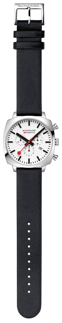 MONDAINE Grand Cushion MSL.41410.LBV.SET sind sportlich-elegante Herrenuhren mit einem schwarzen Armband aus veganem Leder mit Dornschließe. Das eckige Edelstahlgehäuse ist 41 Millimeter breit. Das weiße Zifferblatt mit Stoppuhr und Datumsanzeige ist durch Saphirglas mit Antireflexbeschichtung geschützt und inspiriert von den ikonischen Bahnhofuhren mit rotem Sekundenzeiger. Der Antrieb der Uhr wird durch ein Quarzwerk Ronda 5030 gewährleistet. Mit einer Wasserdichtigkeit von 5 ATM sind die Uhren regen- und duschbeständig. Im Lieferumfang ist zusätzlich ein Milanaise-Edelstahlarmband enthalten.