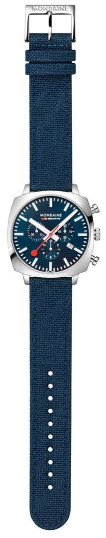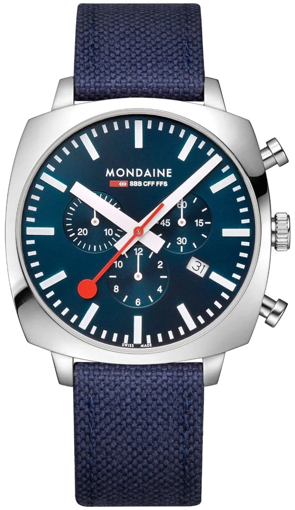MONDAINE Grand Cushion MSL.41440.LD.SET sind sportliche Herren-Quarzuhren mit einem blauen Textilarmband aus recycelten PET-Flaschen mit Korkfutter und Dornschließe. Das quadratische Edelstahlgehäuse ist 41 Millimeter breit. Das blaue Zifferblatt mit Sonnenschliff-Effekt, Stoppuhr und Datumsanzeige wird von einem Saphirglas mit Antireflexbeschichtung geschützt und ist von den ikonischen Bahnhofsuhr inspiriert, mit einem roten Sekundenzeiger. Die Zeiger sind mit einer Super-LumiNova® Leuchtbeschichtung versehen, die perfekte Ablesbarkeit bei schlechten Lichtverhältnissen garantiert. Das Uhrwerk wird von einem Quarzwerk Ronda 5030 angetrieben. Mit einer Wasserdichtigkeit von 5 ATM sind die Uhren regen- und duschbeständig. Im Lieferumfang ist zusätzlich ein Milanaiseband aus Edelstahl enthalten.