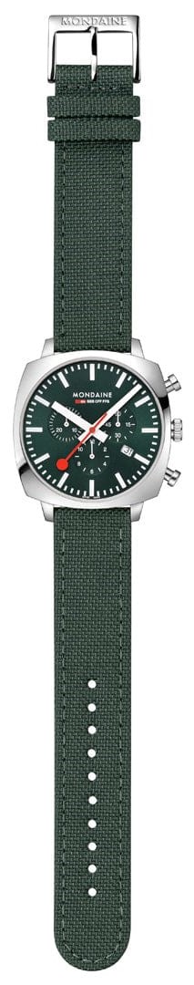 MONDAINE Grand Cushion MSL.41460.LF.SET sind Herrensportuhren mit einem grünen Textilarmband aus recycelten PET-Flaschen mit Korkfutter und Dornschließe. Das quadratische Edelstahlgehäuse ist 41 Millimeter breit. Das grüne Zifferblatt mit Sonnenschliff-Effekt, Stoppuhr und Datumsanzeige ist durch ein Saphirglas mit Antireflexbeschichtung geschützt und inspiriert von den ikonischen Bahnhofsuhr mit rotem Sekundenzeiger. Die Zeiger sind mit einer Leuchtbeschichtung Super-LumiNova® versehen, die perfekte Lesbarkeit bei schlechten Lichtverhältnissen garantiert. Der Antrieb der Uhr wird durch ein Quarzwerk Ronda 5030 gewährleistet. Mit einer Wasserdichtigkeit von 5 ATM sind die Uhren regen- und duschfest. Zum Lieferumfang gehört zusätzlich ein Milanaise-Edelstahlband.