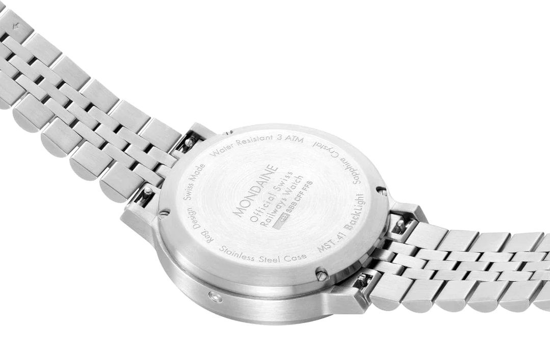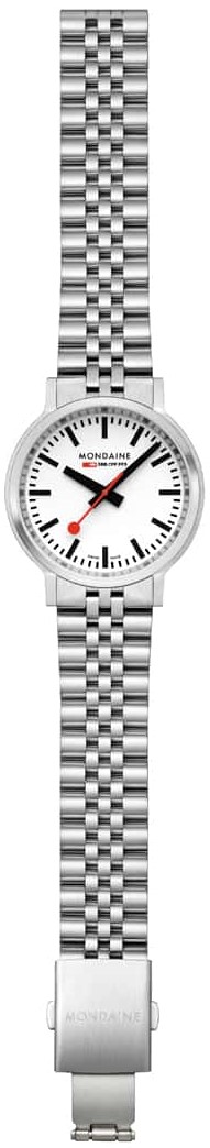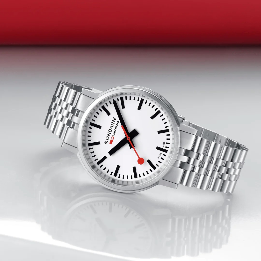 MONDAINE Stop2go MST.4101B.SJ.2SE sind klassische Herrenuhren mit einem Stahlarmband und einer Faltschließe. Das Edelstahlgehäuse hat einen Durchmesser von 41 Millimetern. Das übersichtliche weiße Zifferblatt wird durch ein widerstandsfähiges Saphirglas mit Antireflexbeschichtung geschützt und ist von den ikonischen Bahnhofsuhrendesigns mit einem roten Sekundenzeiger inspiriert. Die Zeiger sind mit einer Super-LumiNova®-Leuchtbeschichtung versehen, die nach dem Aufladen eine perfekte Lesbarkeit bei schlechten Lichtverhältnissen garantiert. Das Uhrwerk wird von einem Quarzwerk mit Stop2go-System angetrieben, das auf einem Umlauf des Sekundenzeigers in 58 Sekunden basiert. Danach bleibt er für 2 Sekunden stehen und der Minutenzeiger springt um eine volle Minute vor. Dasselbe System wird seit 1940 in den Bahnhofsuhrender Schweizerischen Bundesbahnen (SBB) verwendet, um eine genaue Zeitsynchronisation an allen Bahnhöfen zu gewährleisten. Mit einer Wasserdichtigkeit von 3 ATM sind die Uhren regen- und handwaschbeständig. Die Uhren werden mit einem Stift zur einfachen Zeiteinstellung und Zeigerjustierung geliefert.