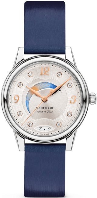 Das Zifferblatt ist mit 8 Diamanten von 0,046 ct verziert. Im Lieferumfang ist ein zusätzliches blaues Lederarmband enthalten.