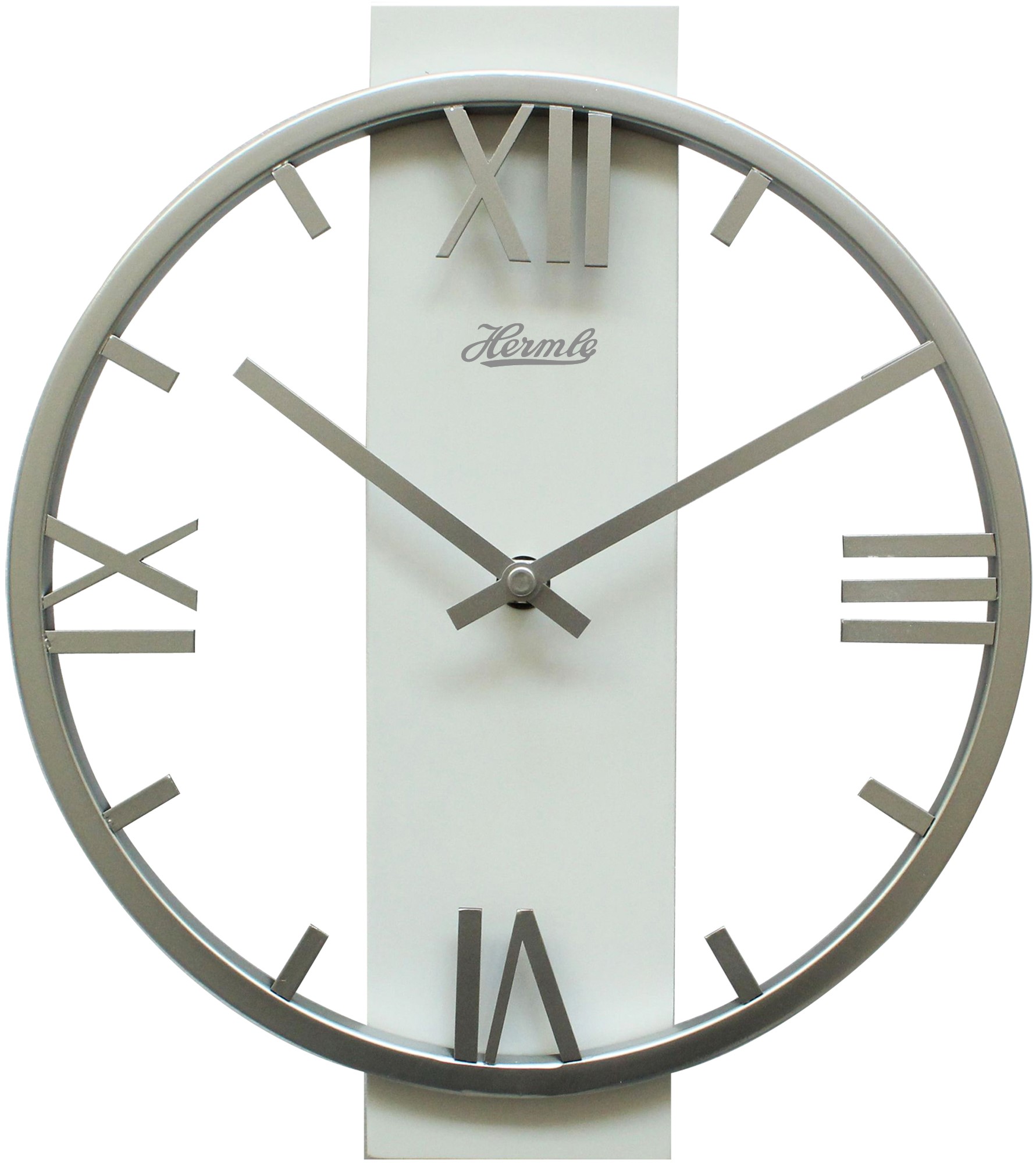 Moderní quartzové nástěnné hodiny s matně stříbrným ohraničením číselníku, s hliníkovými ručičkami a římskými čísly.