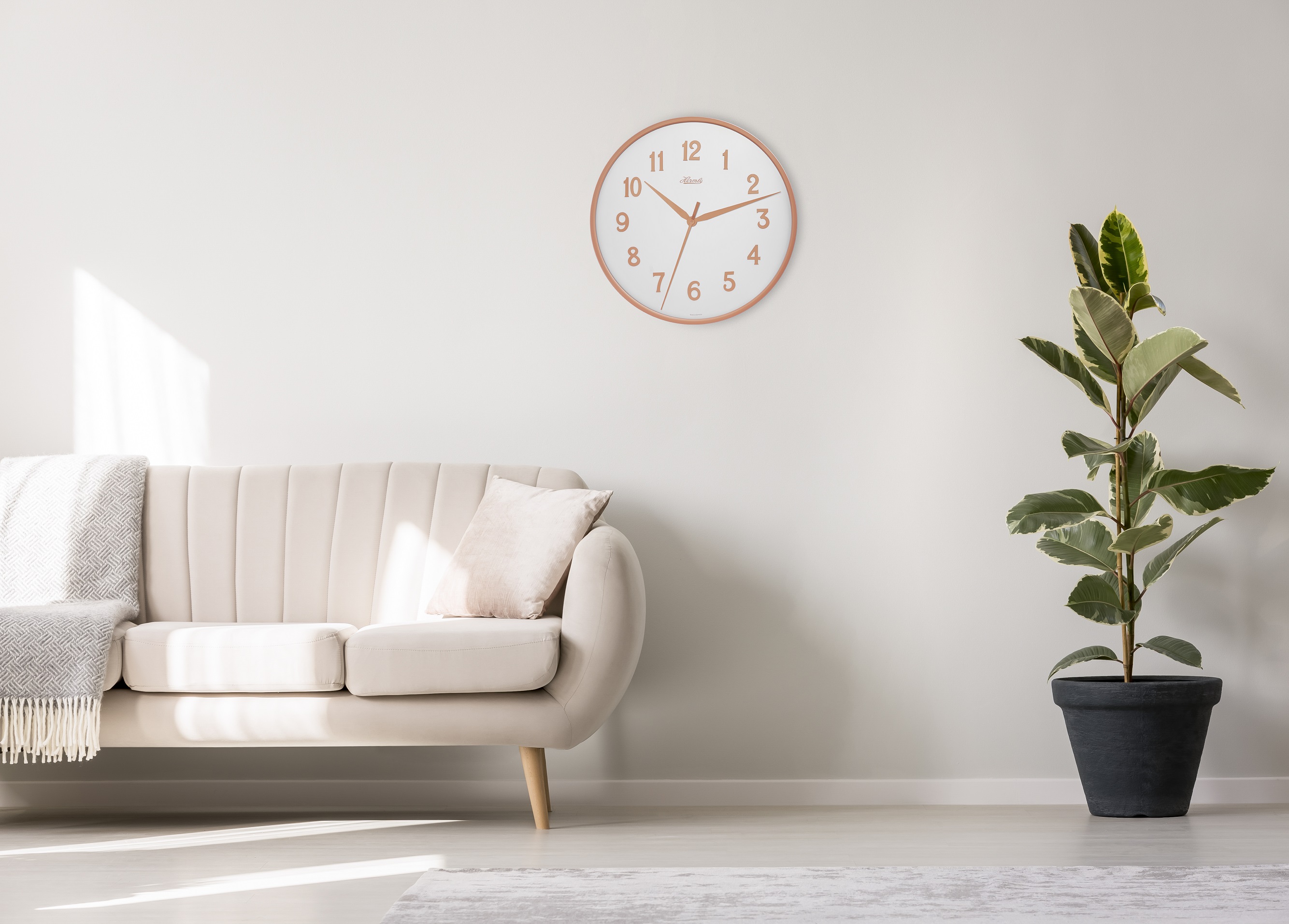 Nástěnné quartzové hodiny v minimalistickém moderním designu.