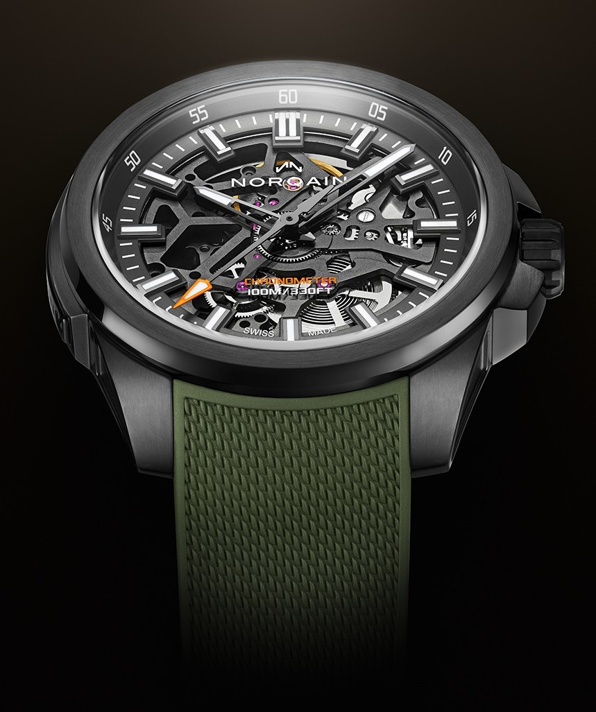 Die Independence-Kollektion umfasst Sportmodelle, die auf Innovation setzen. Gleichzeitig bringt Norqain hier sein charakteristisches modernes Design ein, das zu einem tragenden Element wird. Die für diese Kollektion charakteristischen Formen haben sowohl die Independence-Modelle mit klassischem Stahlgehäuse als auch die Wild One-Modelle, die ein geschichtetes Gehäuse aus mehreren Materialien haben. Das innere Gehäuse besteht aus Titan, das von einer Gummischicht umgeben ist, die Stöße dämpft und den Uhren gleichzeitig einen farblichen Akzent verleiht. Das äußere Gehäuse besteht aus dem Verbundmaterial Norteq.