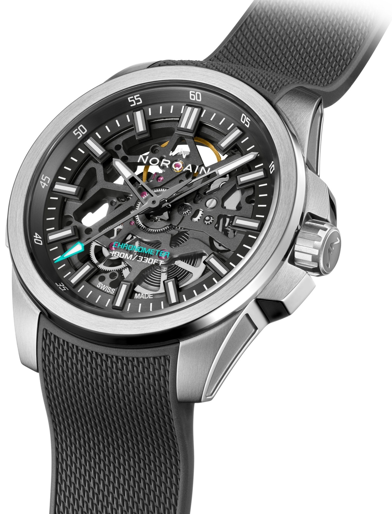 Die Independence-Kollektion umfasst Sportmodelle, die auf Innovation setzen. Gleichzeitig bringt Norqain hier sein charakteristisches modernes Design ein, das zu einem tragenden Element wird. Die für diese Kollektion charakteristischen Formen haben sowohl die Independence-Modelle mit klassischem Stahlgehäuse als auch die Wild One-Modelle, die ein geschichtetes Gehäuse aus mehreren Materialien haben. Das innere Gehäuse besteht aus Titan, das von einer Gummischicht umgeben ist, die Stöße dämpft und den Uhren gleichzeitig einen farblichen Akzent verleiht. Das äußere Gehäuse besteht aus dem Verbundmaterial Norteq.