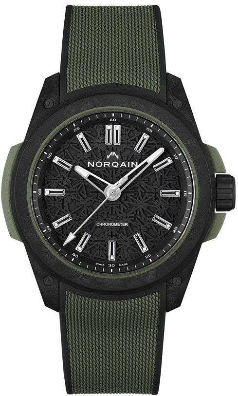 Die Independence-Kollektion umfasst Sportmodelle, die auf Innovation setzen. Gleichzeitig bringt Norqain hier sein charakteristisches modernes Design ein, das zu einem tragenden Element wird. Die für diese Kollektion charakteristischen Formen haben sowohl die Independence-Modelle mit klassischem Stahlgehäuse als auch die Wild One-Modelle, die ein geschichtetes Gehäuse aus mehreren Materialien haben. Das innere Gehäuse besteht aus Titan, das von einer Gummischicht umgeben ist, die Stöße dämpft und den Uhren gleichzeitig einen farblichen Akzent verleiht. Das äußere Gehäuse besteht aus dem Verbundmaterial Norteq.
