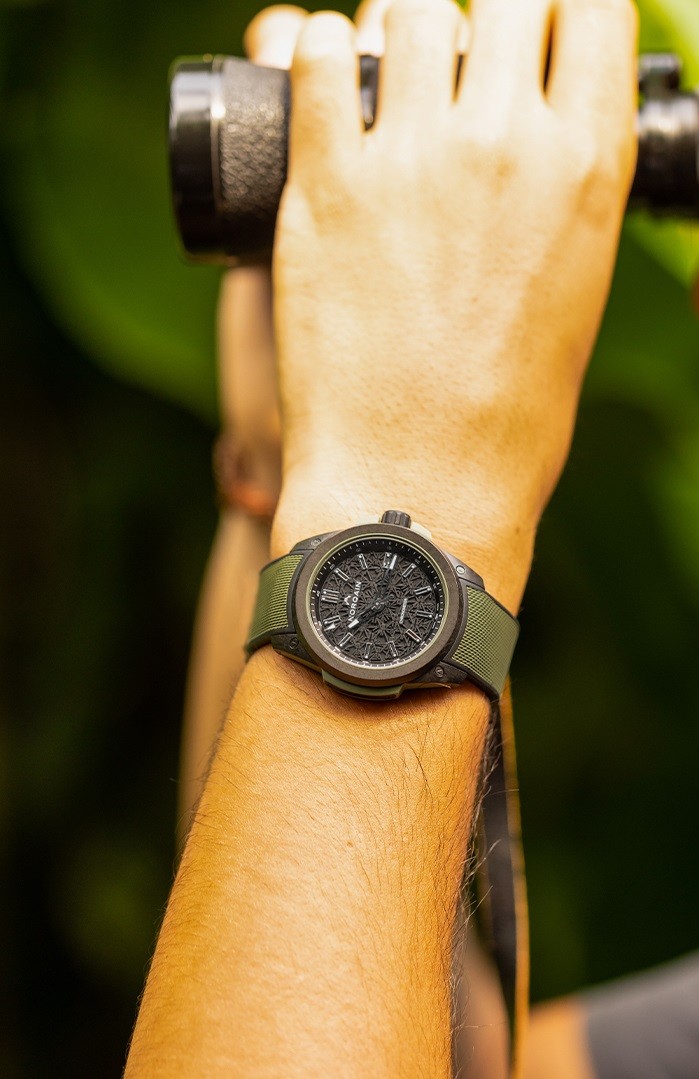 Dies ist ein patentiertes Material, das sechsmal leichter als Stahl und 3,5-mal leichter als Titan ist. Es handelt sich um einen speziellen Kohlefaserverbundstoff, der sich nicht nur auf die für Kohlefaser charakteristische schwarze Farbe beschränkt. In der Uhrmacherei ist dies der erste Einsatz eines solchen beliebig gefärbten Verbundstoffs. Als obere Schicht kann auch jedes andere Material verwendet werden, es gibt also auch ein spezielles Modell Wild One mit einem goldenen Gehäuse. Das Konzept dieser Uhren stammt von dem legendären Manager Jean-Claude Biver, der als Berater des Vorstands der Marke Norqain tätig ist. Dank der einzigartigen Konstruktion bestehen die Wild One-Modelle auch anspruchsvolle Tests, bei denen die Uhren unter anderem einer Belastung von bis zu 5.000 G ausgesetzt sind. Neben der Widerstandsfähigkeit sind die Uhren auch sehr leicht, beides macht sie zu einem idealen Begleiter für fast jeden Sport.