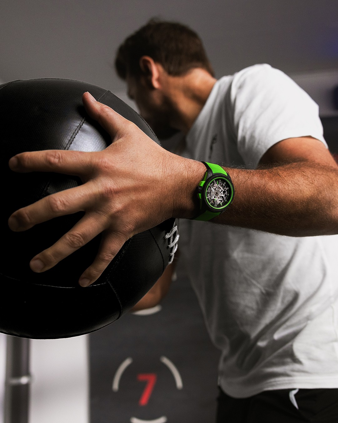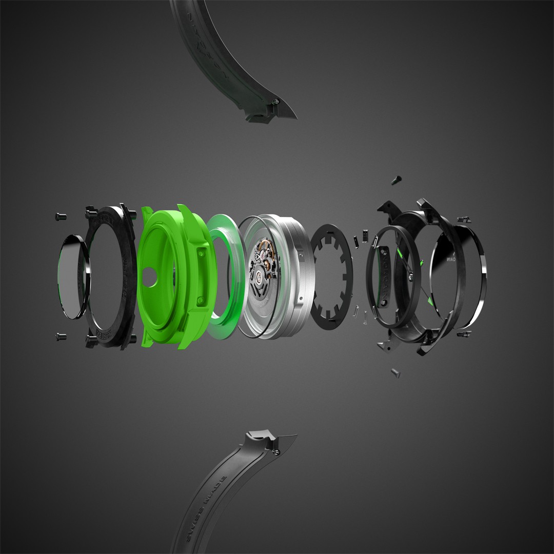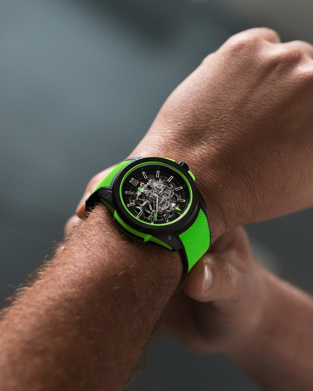 Auf den 100% Schweizer Uhren der Wild ONE Kollektion fällt neben ihrem unglaublichen Leichtgewicht vor allem ihre innovative Konstruktion auf. Das Manufakturkaliber N08S mit automatischem Aufzug, dessen Gangreserve bis zu 41 Stunden beträgt, ist in einem Titangehäuse untergebracht, das von einer Gummischicht umgeben ist, deren Funktion die Stoßdämpfung ist. Das Ganze ist in einem „Käfig“ aus dem patentierten Material NORTEQ geschützt und mit Schrauben gesichert, die speziell für dieses Konzept angefertigt wurden.