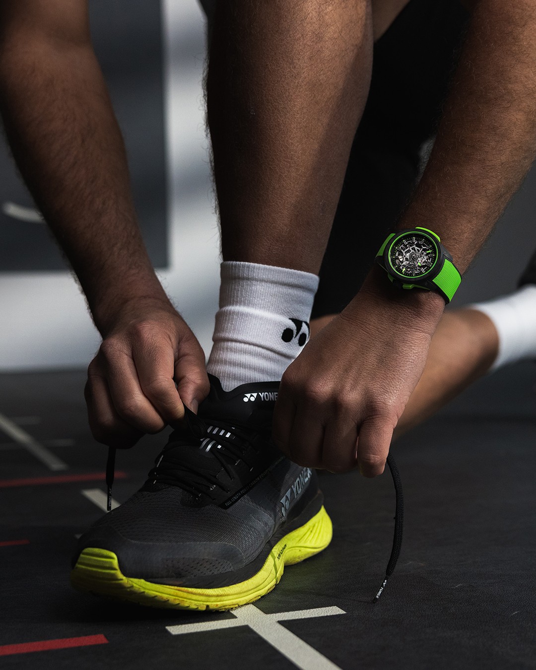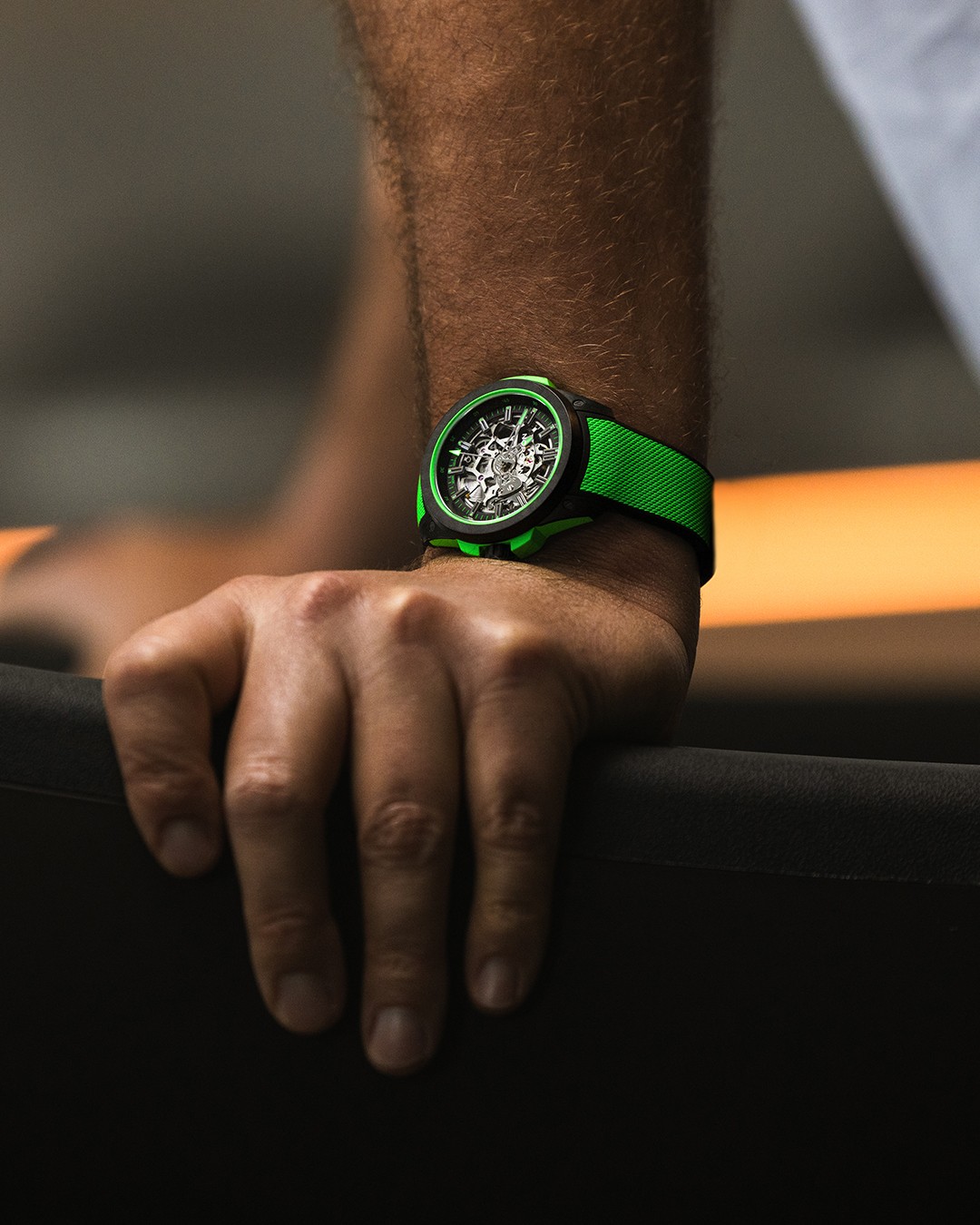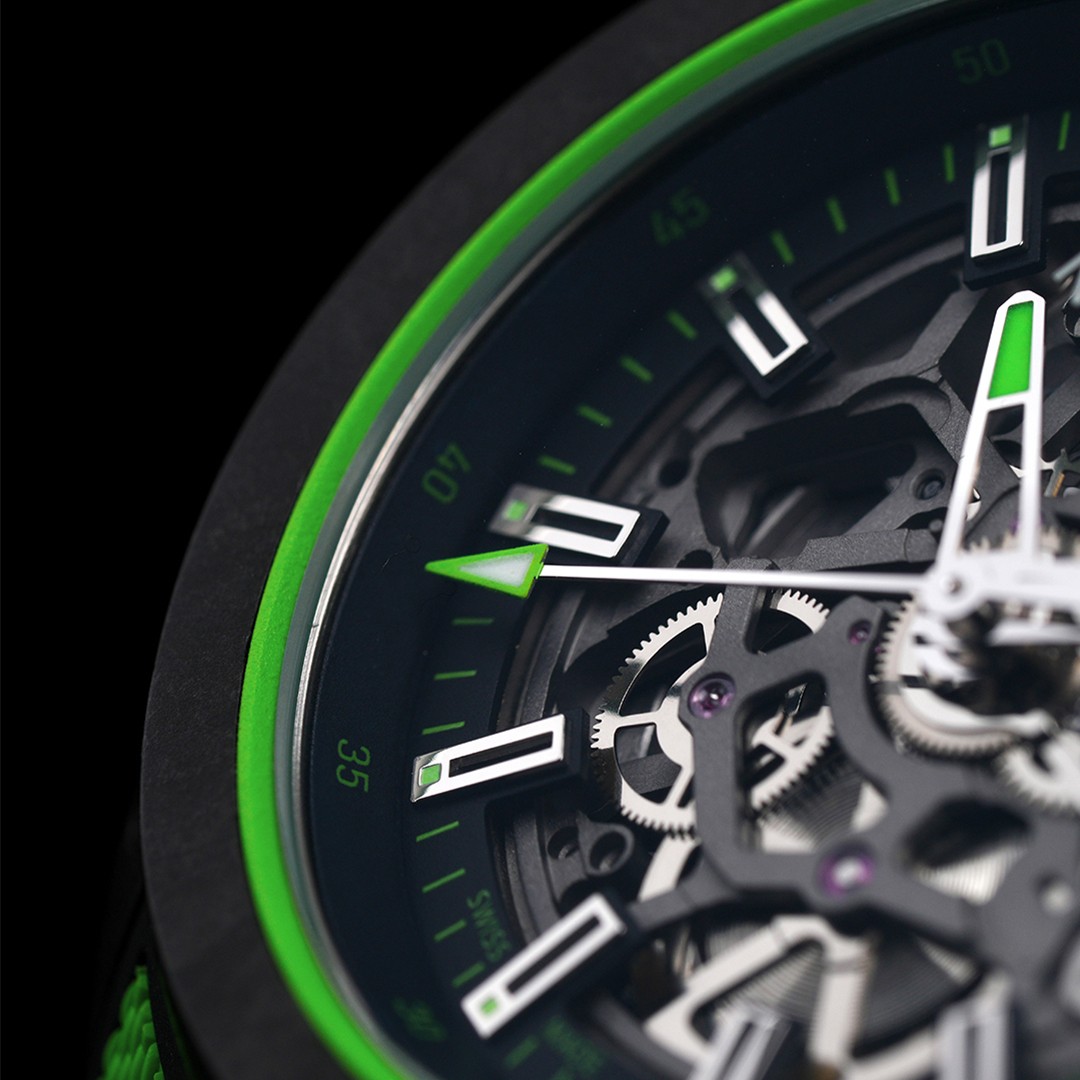 Auf den 100% Schweizer Uhren der Wild ONE Kollektion fällt neben ihrem unglaublichen Leichtgewicht vor allem ihre innovative Konstruktion auf. Das Manufakturkaliber N08S mit automatischem Aufzug, dessen Gangreserve bis zu 41 Stunden beträgt, ist in einem Titangehäuse untergebracht, das von einer Gummischicht umgeben ist, deren Funktion die Stoßdämpfung ist. Das Ganze ist in einem „Käfig“ aus dem patentierten Material NORTEQ geschützt und mit Schrauben gesichert, die speziell für dieses Konzept angefertigt wurden.