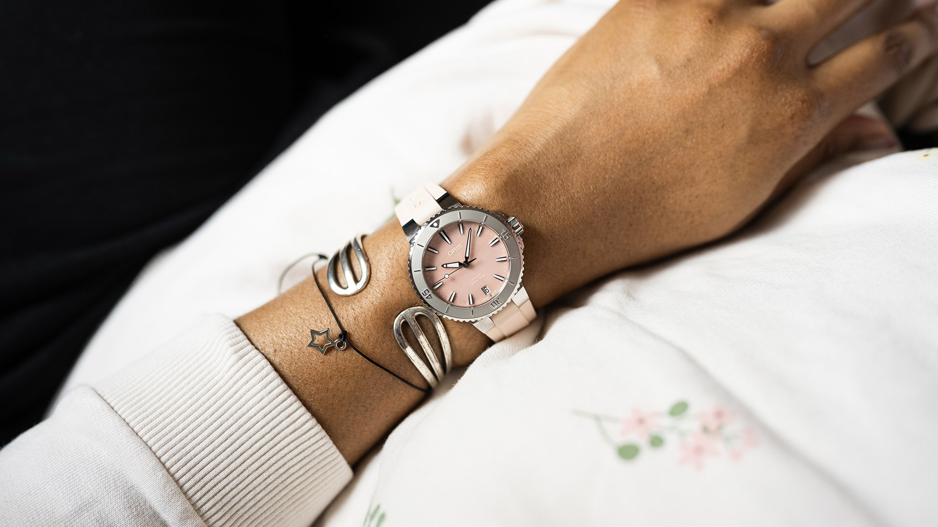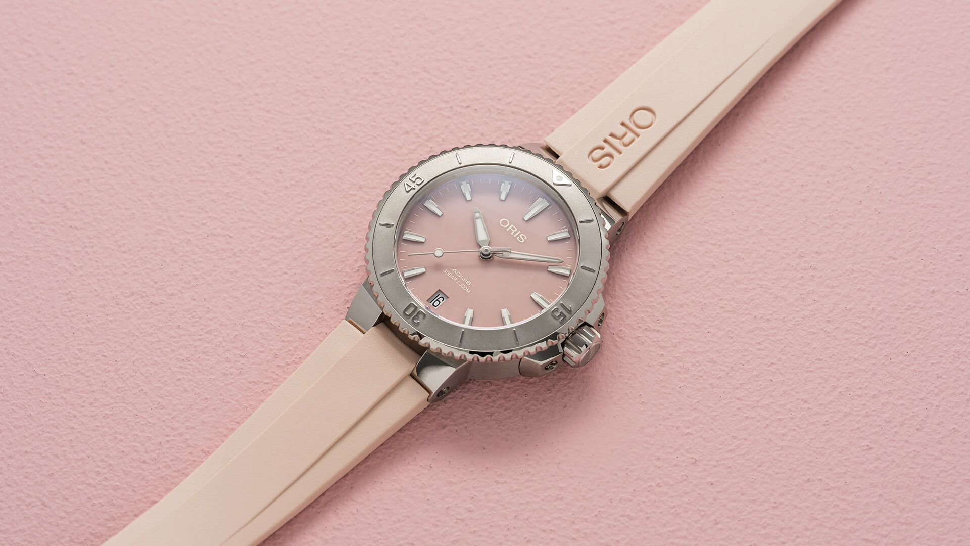 Oris Aquis Date 01 733 7770 4158-07 4 18 66FC sind Damen-Automatikuhr mit rosa Kautschukarmband mit Faltschließe. Das Gehäuse aus Edelstahl hat einen Durchmesser von 36,5 Millimetern, einen transparenten Gehäuseboden und eine einseitig drehbare Lünette mit Taucher-Skala. Das rosa Perlmutt-Zifferblatt mit Datumsanzeige auf der Sechs-Uhr-Position wird durch ein widerstandsfähiges Saphirglas mit Antireflexbeschichtung geschützt und seine Schönheit kommt besonders unter direktem Licht zur Geltung, wenn wir das Farbspiel des Perlmutts beobachten können, das der Wasseroberfläche ähnelt. Die Zeiger, Indizes und ein Teil der Lünette sind mit einer Leuchtbeschichtung Super-LumiNova® versehen, die perfekte Ablesbarkeit bei schlechten Lichtverhältnissen garantiert. Der Antrieb der Uhr erfolgt durch ein mechanisches Kaliber Oris 733 mit automatischem Aufzug und einer Gangreserve von ca. 38 Stunden. Die Basis dieses Kalibers ist die Sellita SW200-1. Dieses Kaliber mit Hacking-Funktion kann bei Bedarf auch manuell über die signierte verschraubte Krone aufgezogen werden. Die Wasserdichtigkeit der Uhr beträgt 30 ATM und sie ist somit eine geeignete Wahl für Schnorcheln und Tauchen.