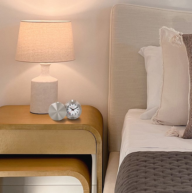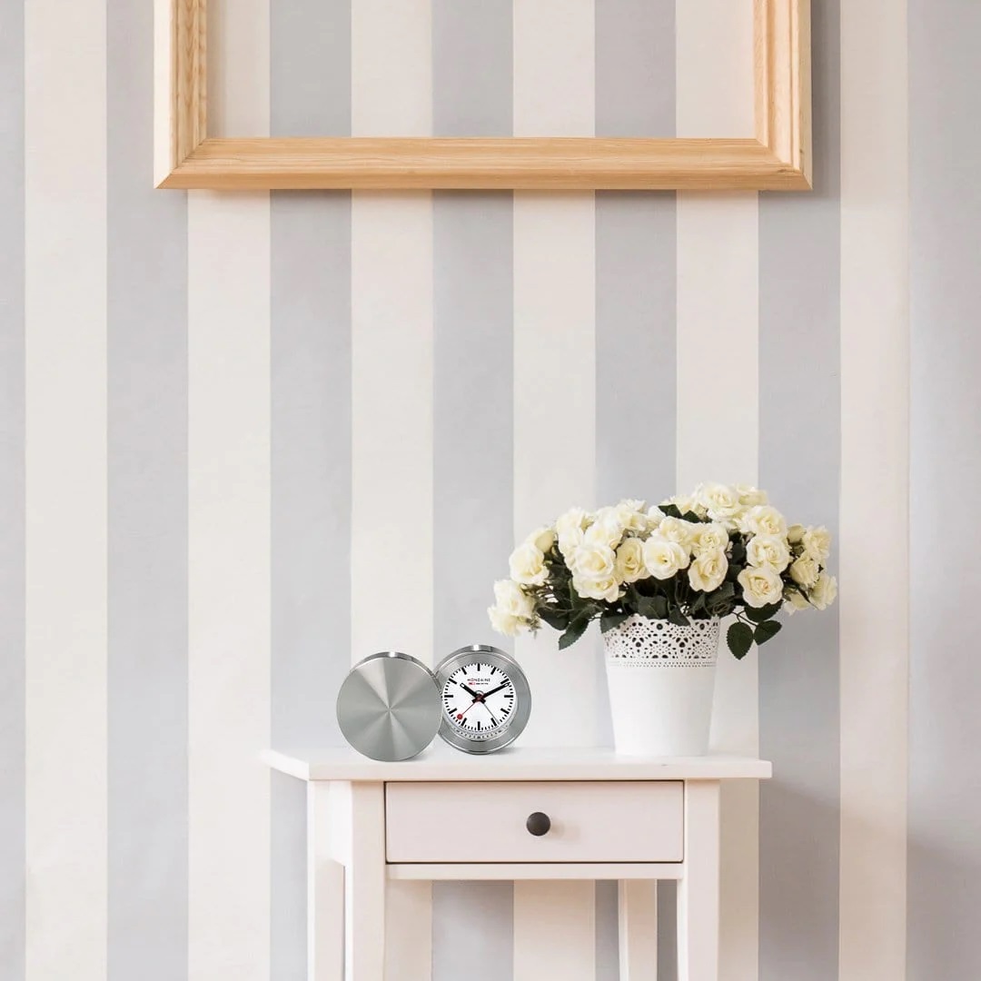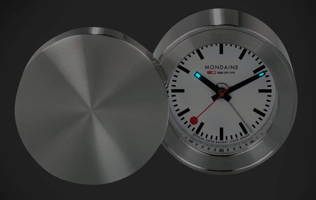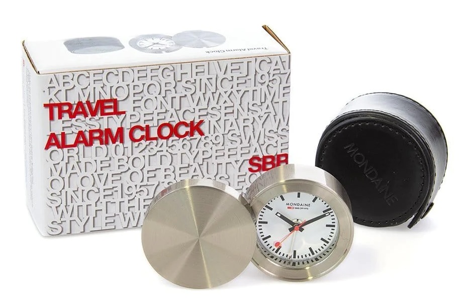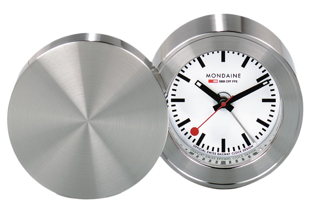 MONDAINE MSM.64410 ist ein Reisewecker, dessen Metallgehäuse einen Durchmesser von 50 Millimetern und eine Dicke von 26 Millimetern hat. Das übersichtliche Zifferblatt in Weiß wird durch gehärtetes Mineralglas geschützt und ist von den ikonischen Bahnhofsuhr mit rotem Sekundenzeiger inspiriert. Die Enden der Stunden- und Minutenzeiger sind mit einer Leuchtbeschichtung versehen, die die Lesbarkeit im Dunkeln erleichtert. Der Uhrbetrieb wird durch ein Quarzwerk gewährleistet.