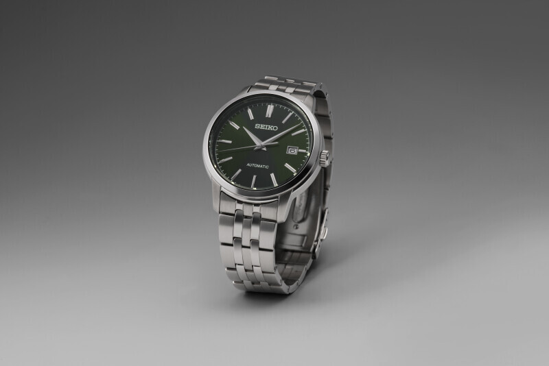 Herren Automatikuhren Seiko Automatic SRPH85K1 mit einem Metallarmband in Kombination aus gebürstetem und glänzendem Finish mit Faltschließe. Das Edelstahlgehäuse hat einen Durchmesser von 41,2 Millimetern und einen transparenten Gehäuseboden. Das dunkelgrüne Zifferblatt mit Sonnenschliff-Effekt und Datumsanzeige wird durch ein widerstandsfähiges Hardlex-Glas geschützt und ergänzt durch Stabindizes mit Dauphine-Zeigern. Der Antrieb der Uhr wird durch ein mechanisches Kaliber 4R35 mit automatischem Aufzug und einer Gangreserve von ca. 41 Stunden gewährleistet. Dieses Manufakturkaliber mit Hacking-Funktion kann bei Bedarf auch manuell über die Krone aufgezogen werden. Die Wasserdichtigkeit der Uhr beträgt 10 ATM und ist somit zum Schwimmen oder Schnorcheln geeignet.