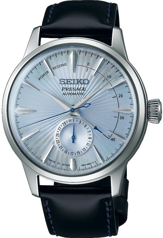 Herrenuhren Seiko Presage Cocktail Time Skydiving SSA343J1 mit Automatik auf einem Lederarmband mit Faltschließe. Das Edelstahlgehäuse mit einer Kombination aus Mattierung und Glanz hat einen Durchmesser von 40,5 Millimetern und einen transparenten Gehäuseboden. Das texturierte, strahlenförmige Zifferblatt in Blau mit Datums- und Gangreserveanzeige zusammen mit dem gewölbten Hardlex-Glas erzeugt einen faszinierenden Effekt, der der Uhr ein interessantes Spiel mit dem Licht ermöglicht. Das Modell ist inspiriert von dem Cocktail Skydiving und ist mit markanten aufgebrachten Stundenindizes in Kombination mit einem Sekundenzeiger in Blau sowie den Zeigern für Datum und Gangreserve ausgestattet. Der Antrieb der Uhr erfolgt durch ein mechanisches Kaliber 4R57 mit automatischem Aufzug und einer Gangreserve von etwa 41 Stunden. Dieses Manufakturkaliber mit Hacking-Funktion kann bei Bedarf auch manuell über die signierte Krone aufgezogen werden. Die Wasserdichtigkeit dieser eleganten Uhr beträgt 5 ATM und sie sind somit gegen Regen und beim Duschen geschützt.