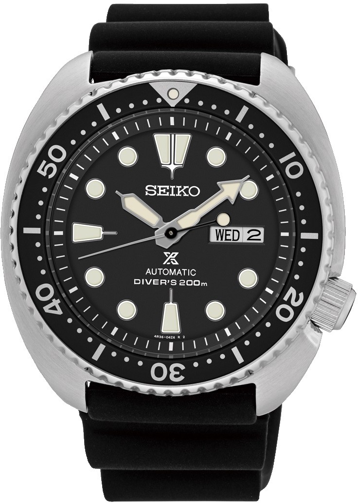 Herren Automatikuhren Seiko Prospex SRPE93K1 mit einem Silikonarmband mit Dornschließe. Typisch geformtes Gehäuse in Form eines Schildkrötenpanzers aus Edelstahl mit einer Kombination aus Mattierung und Glanz hat einen Durchmesser von 45 Millimetern und eine einseitig drehbare Lünette mit einer Aluminiumeinlage mit Taucher-Skala. Unter Fans ist diese Gehäuseform auch als „Turtle“ bekannt. Das schwarze Zifferblatt mit Tages- und Datumsanzeige wird durch ein widerstandsfähiges Hardlex-Glas geschützt. Die aufgetragenen Stundenindizes sind ebenso wie die Zeiger und die Lünette mit einem lumineszierenden Anstrich LumiBrite versehen, der perfekte Ablesbarkeit bei schlechten Lichtverhältnissen garantiert. Der Antrieb der Uhr wird durch ein mechanisches Kaliber 4R36 mit automatischem Aufzug und einer Gangreserve von ca. 41 Stunden gewährleistet. Dieses Manufakturkaliber mit Hacking-Funktion kann bei Bedarf auch manuell über die verschraubte Krone aufgezogen werden. Die Wasserdichtigkeit der Uhr beträgt 20 ATM und mit der ISO 6425-Zertifizierung sind sie eine geeignete Wahl für das Gerätetauchen.