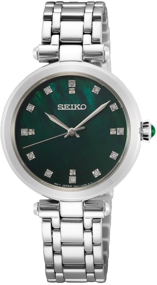 Damen-Quarzuhr Seiko Quartz SRZ535P1 mit Metallarmband und Faltschließe, die Ihr tägliches Outfit perfekt ergänzt. Das Edelstahlgehäuse hat einen Durchmesser von 30 Millimetern und eine Krone mit einem grünen Kabochon. Das grüne Perlmuttzifferblatt mit 12 Diamanten wird durch Saphirglas geschützt und seine Schönheit kommt besonders bei direktem Licht zur Geltung, wenn man das Farbspiel des Perlmutts beobachten kann. Der Antrieb der Uhr erfolgt durch ein zuverlässiges Quarzwerk 7N01. Die Wasserdichtigkeit der Uhr beträgt 5 ATM und ist somit gegen Regen und beim Duschen geschützt.