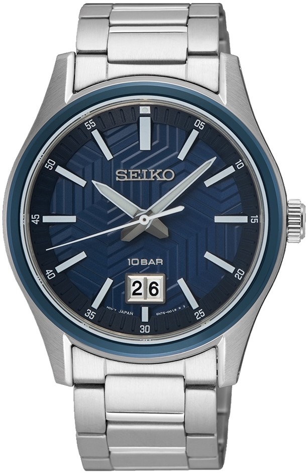 Herren-Quarzuhren Seiko Quartz SUR559P1 mit Metallarmband und Klappschließe. Das Gehäuse aus Edelstahl hat einen Durchmesser von 39,5 Millimetern und eine Lünette mit blauer PVD-Beschichtung. Das blaue, strukturierte Zifferblatt mit Datumsanzeige im big date Format wird durch ein widerstandsfähiges Hardlex-Glas geschützt. Die aufgebrachten Stundenindizes sind ebenso wie die Zeiger mit einer lumineszierenden Beschichtung LumiBrite versehen, die eine perfekte Ablesbarkeit bei schlechten Lichtverhältnissen garantiert. Der Antrieb der Uhr erfolgt durch ein zuverlässiges Quarzwerk 6N76. Die Wasserdichtigkeit der Uhr beträgt 10 ATM und ist somit zum Schwimmen oder Schnorcheln geeignet.