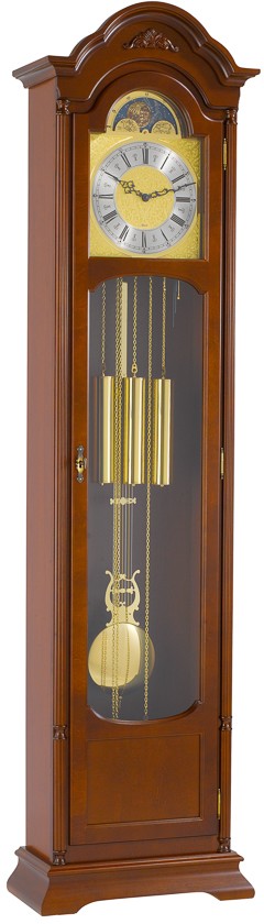 Freistehende Standuhr aus massivem Ahorn-/Erlenholz in Nussbaumfarbe. Die Uhr wird von einem mechanischen Seilzugwerk mit acht Tagen Gangreserve angetrieben. Jede Viertelstunde spielt sie einen Teil der Westminster-Melodie und zur vollen Stunde schlägt sie die entsprechende Anzahl der Stunden, zudem verfügt sie über eine automatische Nachtabschaltung des Schlagwerks (21:45-7:00). Das Spielen der Melodie und das Schlagwerk können vollständig ausgeschaltet werden. Über dem gold-silbernen Messingzifferblatt, das mit detailliert gearbeiteten Ornamenten verziert ist, befindet sich ein Mondphasenanzeiger. Das Pendel in Lyraform ist aus poliertem Messing.