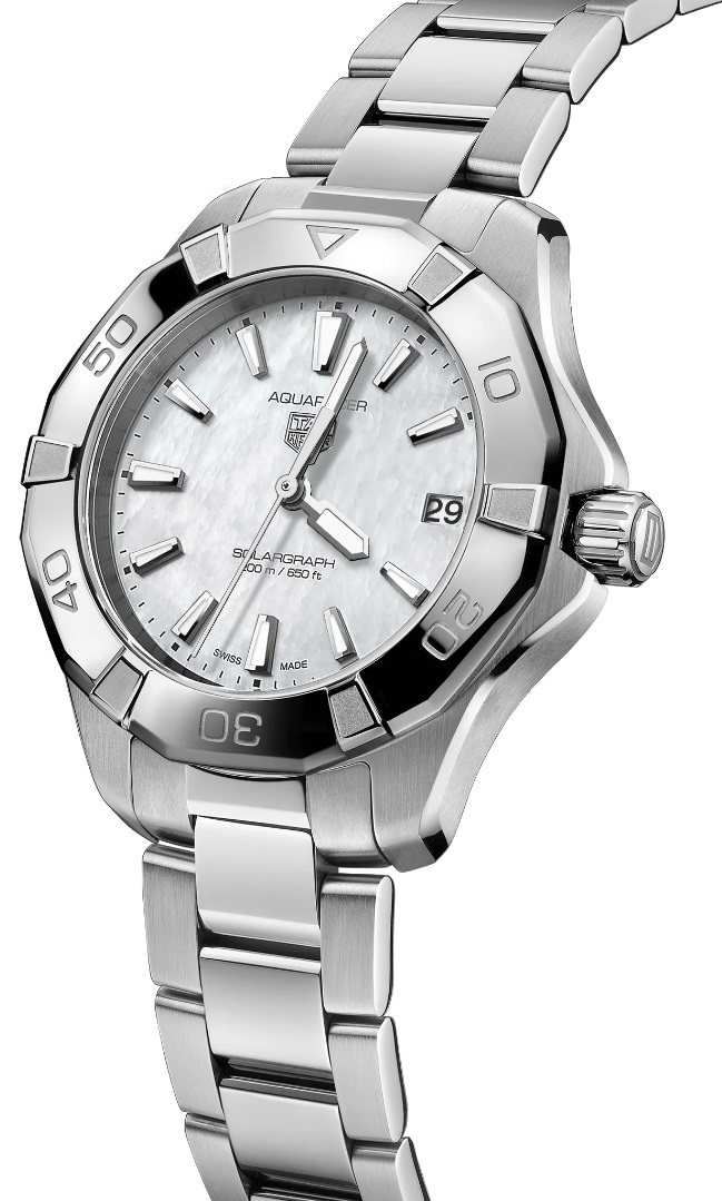 Tag Heuer Aquaracer Professional 200 Solargraph WBP1312.BA0005 sind Damenarmbanduhren im klassischen Stil mit einem Stahlarmband und einer Faltschließe. Das Gehäuse aus Edelstahl hat einen Durchmesser von 34 Millimetern, eine verschraubte Krone und eine einseitig drehbare Lünette mit Minutenmarkierung. Das Perlmutt-Zifferblatt mit einer Datumsanzeige auf der Drei-Uhr-Position wird durch ein widerstandsfähiges Saphirglas geschützt und seine Schönheit kommt besonders bei direktem Licht zur Geltung, wenn das Farbspiel des Perlmutts beobachtet werden kann. Die Zeiger sind mit Super-LumiNova®-Beschichtung versehen, um die bestmögliche Ablesbarkeit bei schlechten Lichtverhältnissen zu gewährleisten. Der Antrieb erfolgt durch ein Schweizer TH50-01 Uhrwerk mit Solarantrieb. Mit einer Wasserdichtigkeit von 20 ATM sind die Uhren für das Tiefseetauchen geeignet.