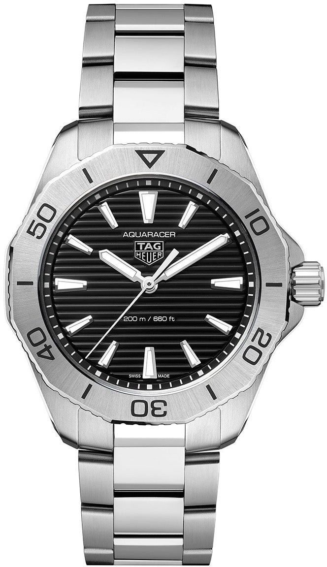 Tag Heuer Aquaracer Professional 200 WBP1110.BA0627 sind Herrenuhren im klassischen Stil mit einem Stahlarmband und einer Faltschließe. Das Edelstahlgehäuse hat einen Durchmesser von 40 Millimetern, eine verschraubte Krone und eine einseitig drehbare Lünette mit Minutenskala. Das schwarze Zifferblatt mit horizontaler Textur wird durch ein widerstandsfähiges Saphirglas geschützt. Die Zeiger und Indizes sind mit Super-LumiNova® beschichtet, um die bestmögliche Ablesbarkeit bei schlechten Lichtverhältnissen zu gewährleisten. Der Antrieb erfolgt durch ein Schweizer Quarzwerk. Mit einer Wasserdichtigkeit von 20 ATM sind die Uhren für das Tiefseetauchen geeignet.