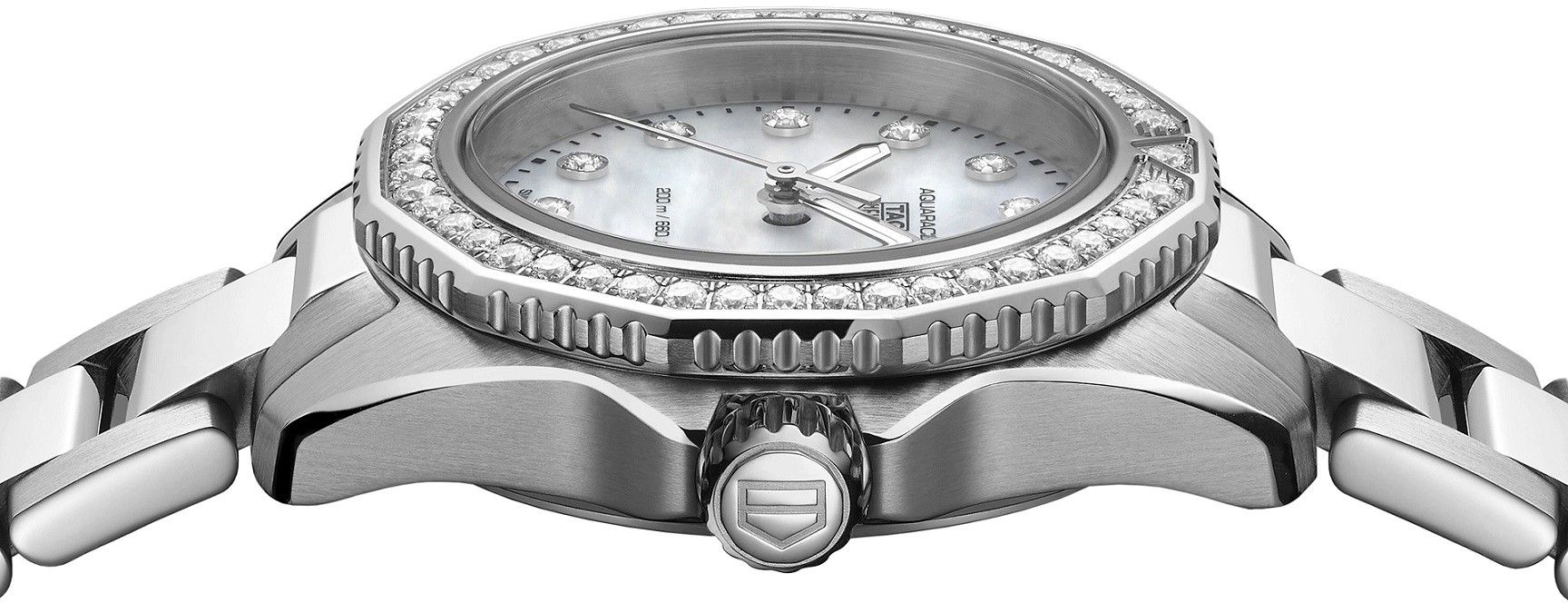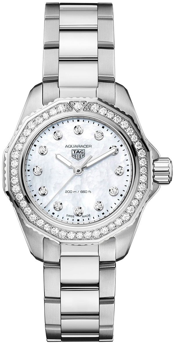 Tag Heuer Aquaracer Professional 200 WBP1417.BA0622 sind Damenuhren im klassischen Stil mit einem Edelstahlarmband und einer Faltschließe. Das Gehäuse aus Edelstahl hat einen Durchmesser von 30 Millimetern, eine verschraubte Krone und eine Lünette, die mit 46 Diamanten mit einem Gewicht von 0,552 ct und Reinheit VS verziert ist. Das Perlmutt-Zifferblatt mit 12 Diamanten mit einem Gewicht von 0,117 ct und Reinheit VS wird durch ein widerstandsfähiges Saphirglas geschützt und seine Schönheit kommt besonders bei direktem Licht zur Geltung, wenn man das Farbspiel des Perlmutts beobachten kann. Die Zeiger und Indizes sind mit einem Super-LumiNova®-Anstrich versehen, um die bestmögliche Ablesbarkeit bei schlechten Lichtverhältnissen zu gewährleisten. Der Antrieb erfolgt durch ein Schweizer Quarzwerk. Mit einer Wasserdichtigkeit von 20 ATM ist die Uhr für das Tiefseetauchen geeignet.