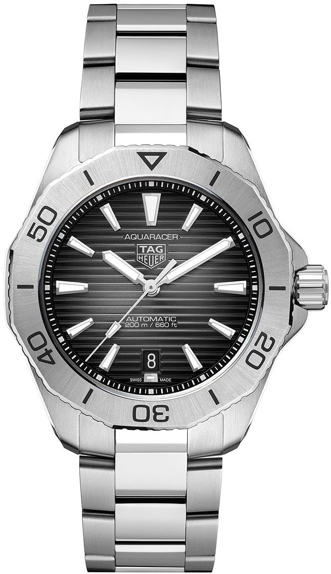 Tag Heuer Aquaracer Professional 200 WBP2110.BA0627 sind Herren-Taucheruhren mit Automatikwerk und Stahlarmband mit Faltschließe. Das Edelstahlgehäuse hat einen Durchmesser von 40 Millimetern, eine verschraubte Krone und eine einseitig drehbare Lünette mit Minutenskala. Das schwarze, verlaufende Zifferblatt mit horizontaler Textur und Datumsanzeige bei sechs Uhr wird durch ein widerstandsfähiges Saphirglas geschützt. Die Zeiger und Indizes sind mit Super-LumiNova® beschichtet, um die bestmögliche Ablesbarkeit bei schlechten Lichtverhältnissen zu gewährleisten. Der Antrieb erfolgt durch ein Schweizer mechanisches Werk Calibre 5 mit Automatikaufzug und einer Gangreserve von 38 Stunden. Mit einer Wasserdichtigkeit von 20 ATM sind die Uhren für das Tiefseetauchen geeignet.
