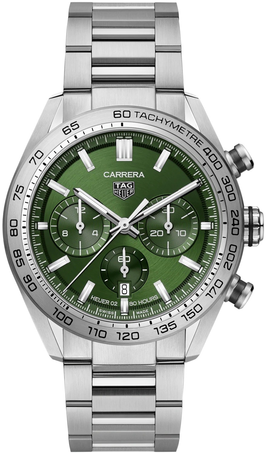 Tag Heuer Carrera Chronograph CBN2A10.BA0643 sind luxuriöse Herren-Sportautomatikuhren mit einem Stahlarmband und einer Faltschließe. Das Edelstahlgehäuse hat einen Durchmesser von 44 Millimetern, eine Lünette mit Tachymeterskala und einen transparenten Gehäuseboden, der einen Blick auf das mit Genfer Streifen dekorierte Uhrwerk bietet. Das grüne Zifferblatt mit Sonnenschliff-Effekt, Datumsanzeige, zwei Chronographenzählern und einer laufenden Sekundenanzeige ist durch ein widerstandsfähiges Saphirglas geschützt. Die Zeiger und Indizes sind mit einer Super-LumiNova®-Beschichtung versehen, die eine perfekte Ablesbarkeit bei schlechten Lichtverhältnissen garantiert. Der Antrieb erfolgt durch ein Schweizer Manufakturmechanikwerk Heuer 02 mit automatischem Aufzug und einer Gangreserve von 80 Stunden. Mit einer Wasserdichtigkeit von 10 ATM sind die Uhren zum Schwimmen und Schnorcheln geeignet.