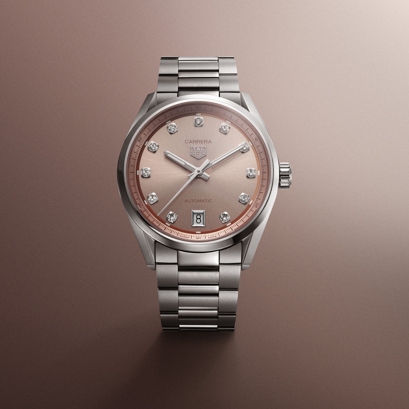 Tag Heuer Carrera WBN231D.BA0001 sind Damen-Uhren im klassischen Stil mit einem Stahlarmband und einer Faltschließe. Das Edelstahlgehäuse hat einen Durchmesser von 36 Millimetern und einen transparenten Gehäuseboden, der einen Blick auf das mit Genfer Streifen und Perlage dekorierte Uhrwerk bietet. Das rosafarbene Zifferblatt mit Sonnenschliff-Effekt, Datumsanzeige und 11 Diamanten mit einem Gewicht von 0,22 ct wird durch ein widerstandsfähiges Saphirglas mit Antireflexbeschichtung geschützt. Die Zeiger und Indizes sind mit einer Super-LumiNova®-Beschichtung versehen, die eine perfekte Ablesbarkeit bei schlechten Lichtverhältnissen garantiert. Der Antrieb erfolgt durch das schweizerische mechanische Kaliber 7 mit automatischem Aufzug und einer Gangreserve von 50 Stunden. Mit einer Wasserdichtigkeit von 5 ATM sind die Uhren gegen Regen und beim Duschen geschützt.