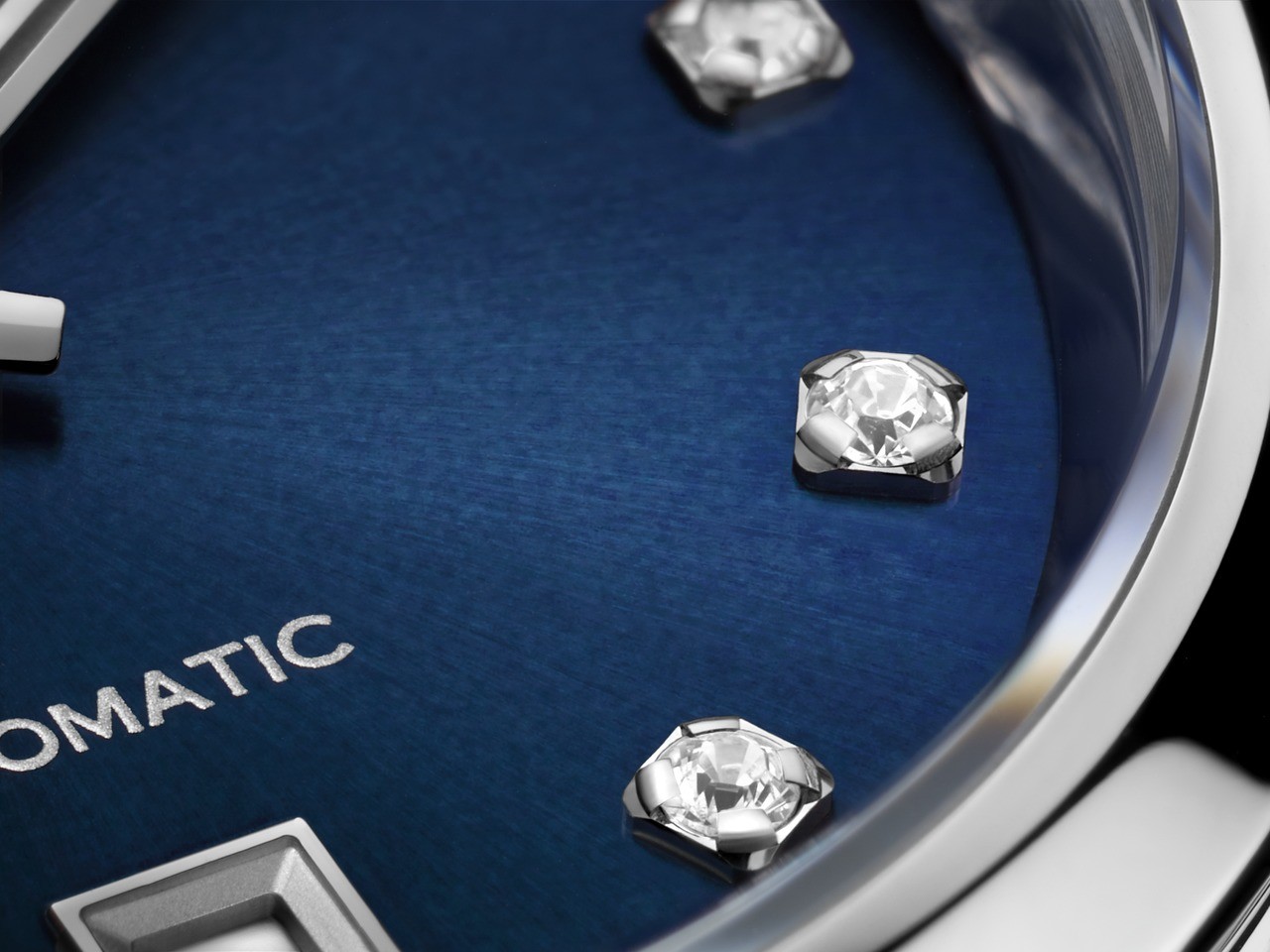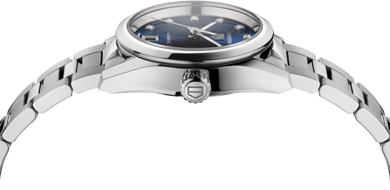 Tag Heuer Carrera WBN2413.BA0621 sind luxuriöse Damen-Automatikuhren im klassischen Stil mit einem Stahlarmband und einer Faltschließe. Das Edelstahlgehäuse hat einen Durchmesser von 29 Millimetern und einen transparenten Gehäuseboden, der einen Blick auf das mit Genfer Streifen und Perlage dekorierte Uhrwerk bietet. Das blaue Zifferblatt mit Sonnenschliff-Effekt, 11 Diamanten mit einem Gewicht von 0,089 ct und einer Datumsanzeige auf der Sechs-Uhr-Position ist durch ein widerstandsfähiges Saphirglas mit Antireflexbeschichtung geschützt. Die Zeiger sind mit einer Super-LumiNova®-Beschichtung versehen, die eine perfekte Ablesbarkeit bei schlechten Lichtverhältnissen garantiert. Der Antrieb erfolgt durch das Schweizer mechanische Uhrwerk Calibre 9 mit automatischem Aufzug und einer Gangreserve von 40 Stunden. Mit einer Wasserdichtigkeit von 10 ATM sind die Uhren für Schwimmen und Schnorcheln geeignet.