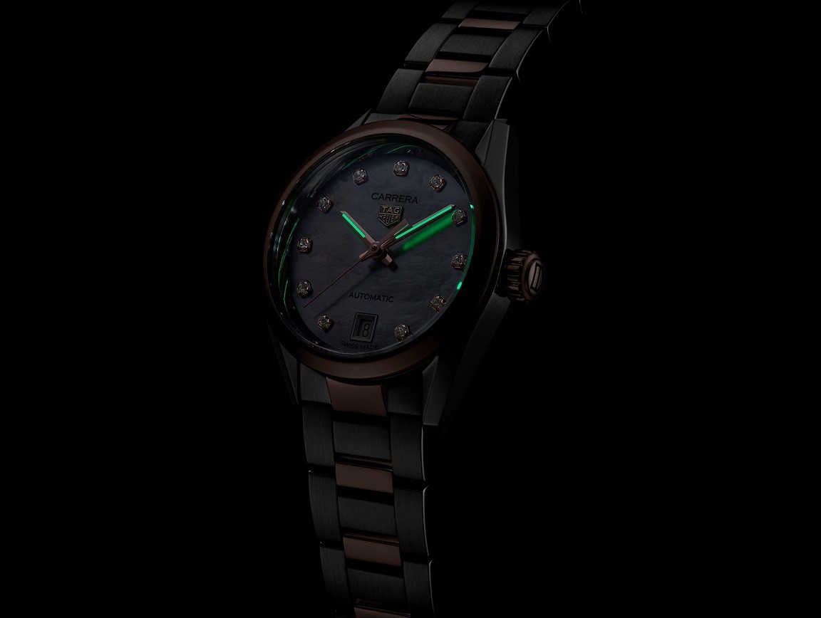 Tag Heuer Carrera WBN2450.BD0569 sind luxuriöse Damen-Automatikuhr mit einem Armband aus Edelstahl und Roségold mit einer Faltschließe. Das Gehäuse aus Edelstahl hat einen Durchmesser von 29 Millimetern und einen transparenten Gehäuseboden, der einen Blick auf das mit Genfer Streifen und Perlage dekorierte Uhrwerk bietet. Die Lünette und Krone sowie einige Glieder des Armbands sind aus 18-karätigem Roségold gefertigt. Das Perlmuttzifferblatt mit 11 Diamanten mit einem Gewicht von 0,088 ct und Datumsanzeige bei sechs Uhr wird von einem widerstandsfähigen Saphirglas mit Antireflexbeschichtung geschützt und seine Schönheit kommt besonders bei direktem Licht zur Geltung, wenn das Farbspiel des Perlmutts beobachtet werden kann. Die Zeiger sind mit einem Super-LumiNova®-Anstrich versehen, der perfekte Ablesbarkeit bei schlechten Lichtverhältnissen garantiert. Der Antrieb wird durch ein Schweizer mechanisches Uhrwerk Calibre 9 mit automatischem Aufzug und einer Gangreserve von 40 Stunden gewährleistet. Mit einer Wasserdichtigkeit von 10 ATM sind die Uhren zum Schwimmen und Schnorcheln geeignet.
