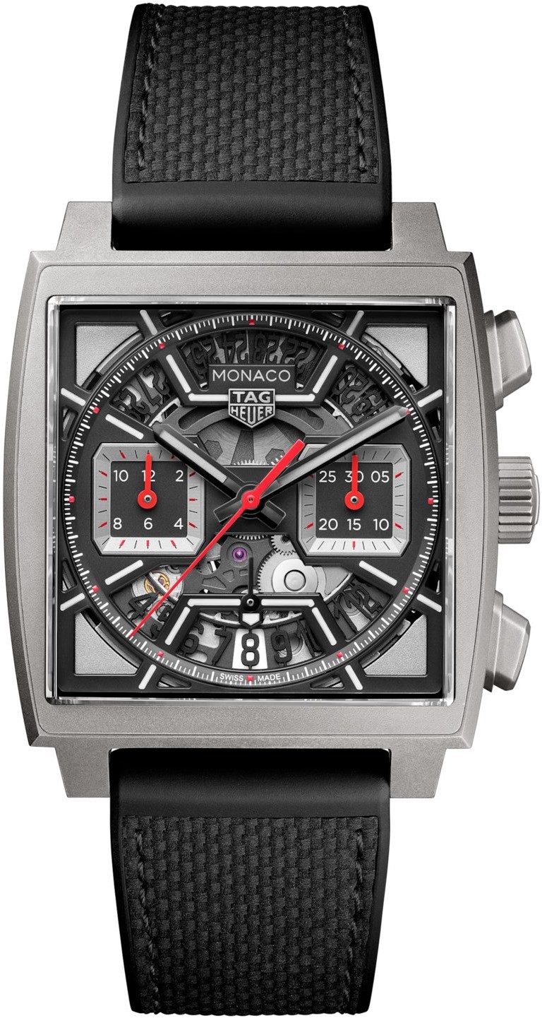 Tag Heuer Monaco CBL2183.FT6236 sind luxuriöse Herrensportuhren mit einem schwarzen Armband aus einer Kombination von Kautschuk, Textil und Lederfutter mit einer Faltschließe. Das quadratische Titan-Gehäuse mit einer Breite von 39 Millimetern hat einen transparenten Gehäuseboden, der einen Blick auf das automatische Uhrwerk mit Genfer Streifen bietet. Das graue skelettierte Zifferblatt mit Datumsanzeige auf sechs Uhr, laufender Sekunde und zwei Hilfszifferblättern mit Stoppuhrfunktion ist durch ein widerstandsfähiges Saphirglas mit Antireflexbeschichtung geschützt. Zeiger, Indizes und andere Elemente auf dem Zifferblatt sind mit einem Super-LumiNova®-Anstrich versehen, um die bestmögliche Lesbarkeit bei schlechten Lichtverhältnissen zu gewährleisten. Der Antrieb der Uhr wird durch ein schweizerisches mechanisches Manufakturwerk TH20-00 mit automatischem Aufzug und einer Gangreserve von 80 Stunden gewährleistet. Mit einer Wasserdichtigkeit von 10 ATM sind die Uhren zum Schwimmen und Schnorcheln geeignet.