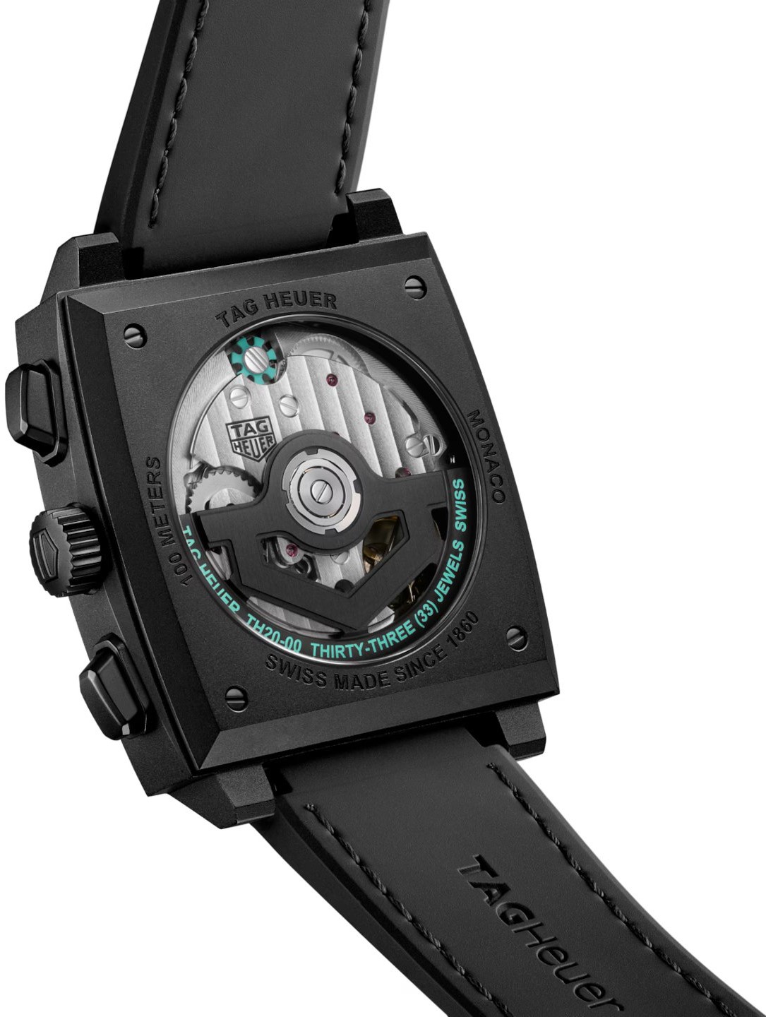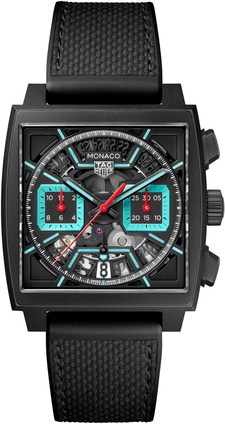 Tag Heuer Monaco CBL2184.FT6236 sind luxuriöse sportliche Herrenuhren mit einem schwarzen Armband aus einer Kombination von Kautschuk, Textil und Lederfutter mit Faltschließe. Das quadratische Titangehäuse mit einer Breite von 39 Millimetern hat eine schwarze DLC-Beschichtung und einen transparenten Gehäuseboden, der einen Blick auf das automatische Werk mit Genfer Streifen bietet. Das schwarze skelettierte Zifferblatt mit Datumsanzeige auf der Sechs-Uhr-Position, laufender Sekunde und zwei Subzifferblättern mit Stoppuhrfunktion wird durch ein widerstandsfähiges Saphirglas mit Antireflexbeschichtung geschützt. Die Zeiger, Indizes und weitere Elemente auf dem Zifferblatt sind mit einer Super-LumiNova®-Beschichtung versehen, um die bestmögliche Ablesbarkeit bei schlechten Lichtverhältnissen zu gewährleisten. Der Antrieb der Uhr erfolgt durch ein Schweizer mechanisches Manufakturwerk TH20-00 mit automatischem Aufzug und einer Gangreserve von 80 Stunden. Mit einer Wasserdichtigkeit von 10 ATM sind die Uhren zum Schwimmen und Schnorcheln geeignet.