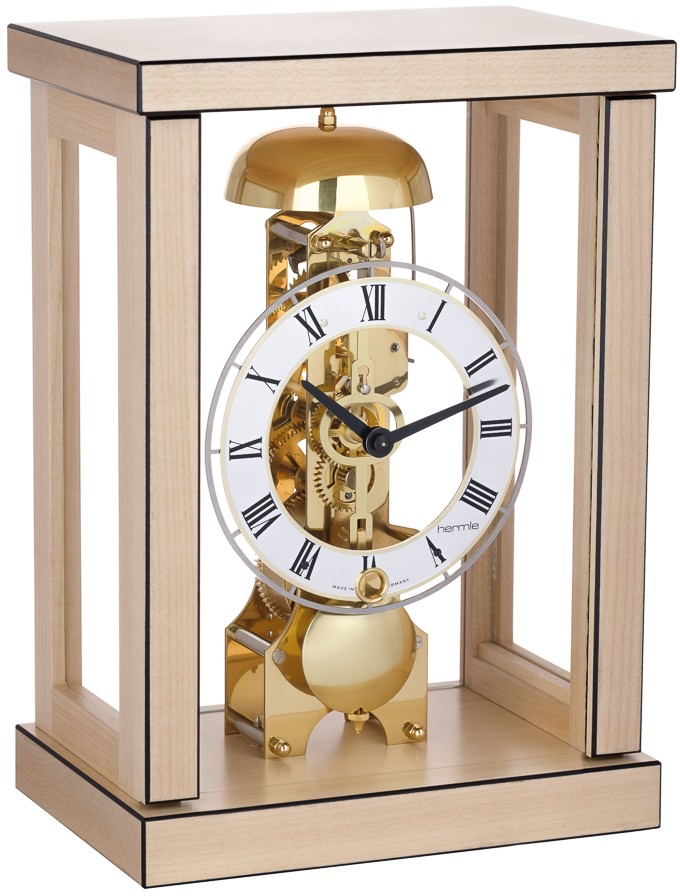 Deutsche Design-Tischuhr mit Messingpendel. Das hölzerne Gehäuse in Eisbuche mit betonten Kanten, verglasten Wänden und vorderen Öffnungstüren schützt das runde Zifferblatt und das mechanische Uhrwerk mit einer vierzehntägigen Gangreserve, das jede volle Stunde schlägt.