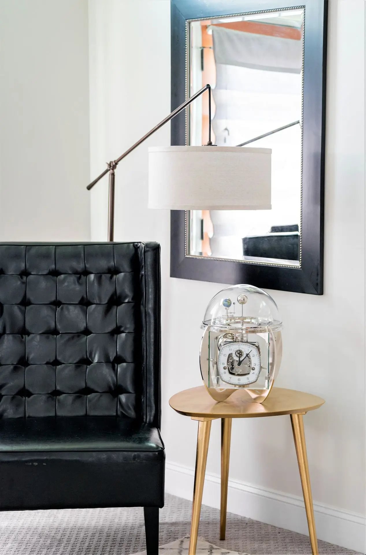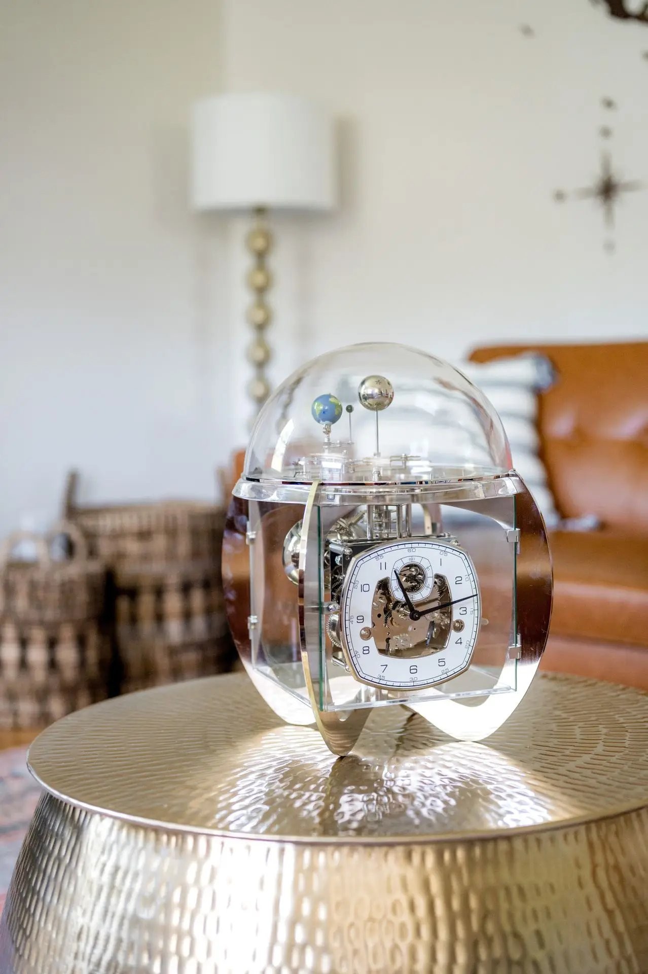 Die Tischuhr Tellurium IV ist ein echtes Design-Meisterwerk, das modernen und klassischen Stil in einer besonderen futuristischen Form vereint. Sie zeichnet sich durch ein skelettiertes Zifferblatt mit Blick auf das mechanische Werk aus, das in einem gläsernen Würfel zu schweben scheint, der von massiven Metallbögen umrahmt ist.