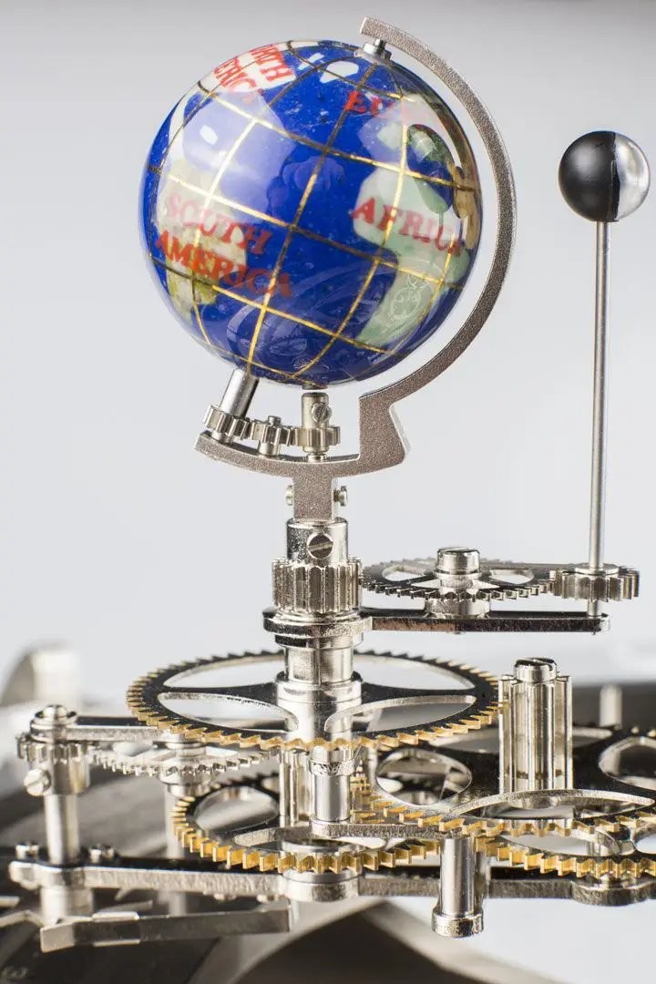 Eine gefräste Rosette mit gedruckten Tierkreiszeichen, Daten und Monaten bietet einen faszinierenden Einblick in die Welt der Astronomie. Durch die Glaskuppel ist die aktuelle Position der Erde zur Sonne, die Erdrotation um die eigene Achse sowie die Reproduktion der von der Erde sichtbaren Mondphasen zu sehen. All dies ermöglicht ein mechanisches Werk mit einer achttägigen Gangreserve, ausgestattet mit 11 Steinen, das einmal viertelstündlich, zweimal halbstündlich, dreimal dreiviertelstündlich und viermal zur vollen Stunde die Westminster-Melodie auf 4 polierten Glocken spielt und die entsprechende Anzahl von Stunden schlägt. Diese Uhr verfügt außerdem über eine automatische Nachtabschaltung des Schlagwerks und einen separaten Sekunden-Subzifferblatt.